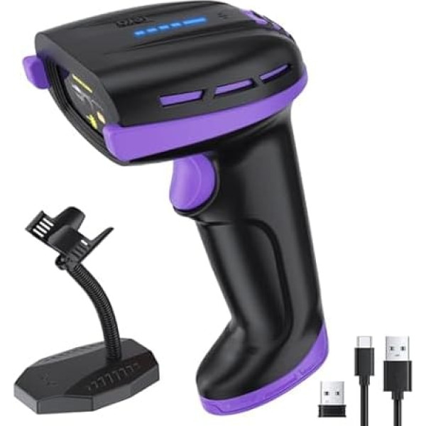 Tera Pro Barcode Scanner with Replaceable Battery: ON/OFF Switch Battery Indicator Wall Mounted Stand 1D 2D QR Compatible with Bluetooth 2.4G Wireless USB Barcode Reader D6100 Purple