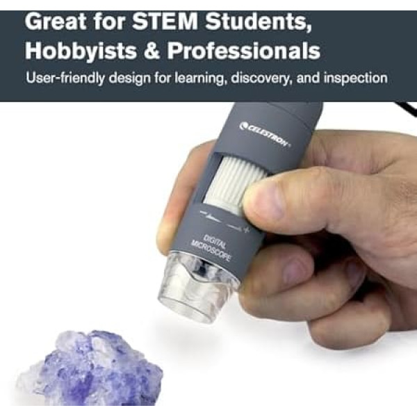 USB powered and handheld: portable and compact Built-in 2MP camera: to take pictures and videos. Large magnification range: large magnification range for many different users: 10x to 200x magnification HIGH RESOLUTION RECORDING: Take pictures at 1920 x 1080 pixels Adjustable lighting: eight adjustable white LED lighting points. MicroCapture Pro software included › See more product details; Product description The Celestron Deluxe Handheld Medium Level Digital Microscope is a user-friendly low magnification microscope. With a 10x to 200x magnification, it is ideal for viewing stamps, coins, insects, plants, stones, skin, gems, circuit boards and more. With the stronger magnification, you can even view traditional slides. And even better, the built-in 2.0MP camera lets you record your discoveries. Press the camera button to save VGA quality photos and videos directly to your PC. Take photos with up to 1920 x 1080 pixels so you can see your object clearly even on large screens. The LED lighting makes your samples appear clear and bright. The included metal tripod allows clear shots and is particularly handy at high magnifications to prevent shake and keep your sample in focus. The Deluxe Handheld Digital Microscope is a fun teaching tool for teenagers and adults. It is suitable for amateurs as well as quality control inspections, medical examinations and scientific research. MicroCapture Pro Software The included software lets you take photos and videos of your discoveries. Measure your samples with the built-in measuring tool. Compatible with operating systems from Windows 7/8/10; MAC OS10.12 and above; Product description The Celestron Deluxe Handheld Medium Level Digital Microscope is a user-friendly low magnification microscope. With a 10x to 200x magnification, it is ideal for viewing stamps, coins, insects, plants, stones, skin, gems, circuit boards and more. With the stronger magnification, you can even view traditional slides. And even better, the built-in 2.0MP camera lets you record your discoveries. Press the camera button to save VGA quality photos and videos directly to your PC. Take photos with up to 1920 x 1080 pixels so you can see your object clearly even on large screens. The LED lighting makes your samples appear clear and bright. The included metal tripod allows clear shots and is particularly handy at high magnifications to prevent shake and keep your sample in focus. The Deluxe Handheld Digital Microscope is a fun teaching tool for teenagers and adults. It is suitable for amateurs as well as quality control inspections, medical examinations and scientific research. MicroCapture Pro Software The included software lets you take photos and videos of your discoveries. Measure your samples with the built-in measuring tool. Compatible with operating systems from Windows 7/8/10; MAC OS10.12 and above; The Celestron Deluxe Handheld Medium Level Digital Microscope is a user-friendly low magnification microscope. With a 10x to 200x magnification, it is ideal for viewing stamps, coins, insects, plants, stones, skin, gems, circuit boards and more. With the stronger magnification, you can even view traditional slides. And even better, the built-in 2.0MP camera lets you record your discoveries. Press the camera button to save VGA quality photos and videos directly to your PC. Take photos with up to 1920 x 1080 pixels so you can see your object clearly even on large screens. The LED lighting makes your samples appear clear and bright. The included metal tripod allows clear shots and is particularly handy at high magnifications to prevent shake and keep your sample in focus. The Deluxe Handheld Digital Microscope is a fun teaching tool for teenagers and adults. It is suitable for amateurs as well as quality control inspections, medical examinations and scientific research. MicroCapture Pro Software The included software lets you take photos and videos of your discoveries. Measure your samples with the built-in measuring tool. Compatible with operating systems from Windows 7/8/10; MAC OS10.12 and above