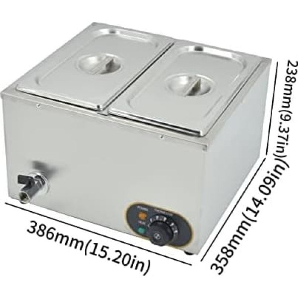 Electric Water Bath: Rated Voltage: 220V-240V/50Hz-60Hz Power: 1500W Temperature Range 30-85°C Overall Dimension: 38.6cm x 35.8cm x 23.8cm Pan Size: 32.5cm x 17.6cm x 14.8cm With Two Compartments and Lid Adjustable temperature: temperature button to adjust the heat level from 30 to 85 °C, the drain tap design makes it easier to drain water inside the container. ★Note: Do not dry the heating tube. It should be submerged in water. Hard material: the electric food warmer is made of food grade stainless steel, equipped with U-shaped thickened heating tube, it is hard, safe and easy to clean. EASY DRAINING WATER The chocolate melting pot comes with a drain tap for convenient draining of water. Wide application: suitable for breakfast shops, snack bars, pastry shops, cooking shops, western restaurants, schools or home use, etc. You can also use it to melt chocolate. › See more product details