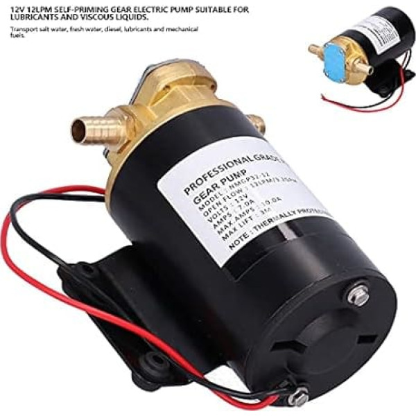 Self-priming electric gear pump with 12V and 12L/min, suitable for lubricants and viscous liquids. Ideal for transporting fresh water, lubricants and machinery (except petrol). Designed for intermittent use only with a 30 minute interval operation cycle. Simple connection system, convenient to use. Soft rubber mount, including 2 x 1/2\; Product description Item type: gear pump. Material: stainless steel. Open flow: 12LPM/3.2GPM Voltage: 12 V. Vamps: 7.0 A. Maximum amps: 10.0 A. Maximum stroke: 3 metres/9.8 ft. Installation Notes: Connect the oil hose first. The red cable is connected to the positive pole (+). The black wire is connected to the negative pole (-) Package list: 1 x gear pump, 1 x manual (English language not guaranteed). Note: Thermally protected.; Product description Item type: gear pump. Material: stainless steel. Open flow: 12LPM/3.2GPM Voltage: 12 V. Vamps: 7.0 A. Maximum amps: 10.0 A. Maximum stroke: 3 metres/9.8 ft. Installation Notes: Connect the oil hose first. The red cable is connected to the positive pole (+). The black wire is connected to the negative pole (-) Package list: 1 x gear pump, 1 x manual (English language not guaranteed). Note: Thermally protected.; Item type: gear pump. Material: stainless steel. Open flow: 12LPM/3.2GPM Voltage: 12 V. Vamps: 7.0 A. Maximum amps: 10.0 A. Maximum stroke: 3 metres/9.8 ft. Installation Notes: Connect the oil hose first. The red cable is connected to the positive pole (+). The black wire is connected to the negative pole (-) Package list: 1 x gear pump, 1 x manual (English language not guaranteed). Note: Thermally protected.
