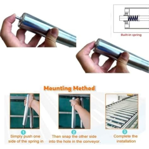SPRING LOCK ASSEMBLY Simply push the spring in or out from the other side to securely install the rollers in the conveyor frame To meet your needs: cylinder diameter from 25 mm to 60 mm, lengths from 100 mm to 1000 mm, shaft diameter of approx. 8 mm/12 mm, and a wide range of sizes to choose from Smooth operation: the surface of the drum is smooth and the rotation is smooth, which minimises friction and ensures the smooth and smooth movement of the conveyed items Stainless steel material: it has good heat resistance, high strength, waterproof, and the surface is galvanised, which can be used in harsh working environments MULTI-PURPOSE: carpentry roller stand, saw rollers, material rollers, boat rollers, dock rollers, kayak loading and unloading rollers, sports bike tire rollers, conveyor belt replacement rollers and cat and dog enclosures › See more product details; Product description Non-powered steel rollers are a reliable alternative to gravity conveyors and can be used to handle and transport goods of different weights, reducing mechanical failures and maintenance costs for you. Specifications: Roller material: stainless steel. Colour: silver. Size: roller diameter: 25 mm. Shank Diameter: 8mm Wheel diameter: 32 mm. Shank Diameter: 50mm Shank Diameter: 12mm (12mm) Roller Diameter 60mm (2.4\; Product description Non-powered steel rollers are a reliable alternative to gravity conveyors and can be used to handle and transport goods of different weights, reducing mechanical failures and maintenance costs for you. Specifications: Roller material: stainless steel. Colour: silver. Size: roller diameter: 25 mm. Shank Diameter: 8mm Wheel diameter: 32 mm. Shank Diameter: 50mm Shank Diameter: 12mm (12mm) Roller Diameter 60mm (2.4\; Non-powered steel rollers are a reliable alternative to gravity conveyors and can be used to handle and transport goods of different weights, reducing mechanical failures and maintenance costs for you. Specifications: Roller material: stainless steel. Colour: silver. Size: roller diameter: 25 mm. Shank Diameter: 8mm Wheel diameter: 32 mm. Shank Diameter: 50mm Shank Diameter: 12mm (12mm) Roller Diameter 60mm (2.4\