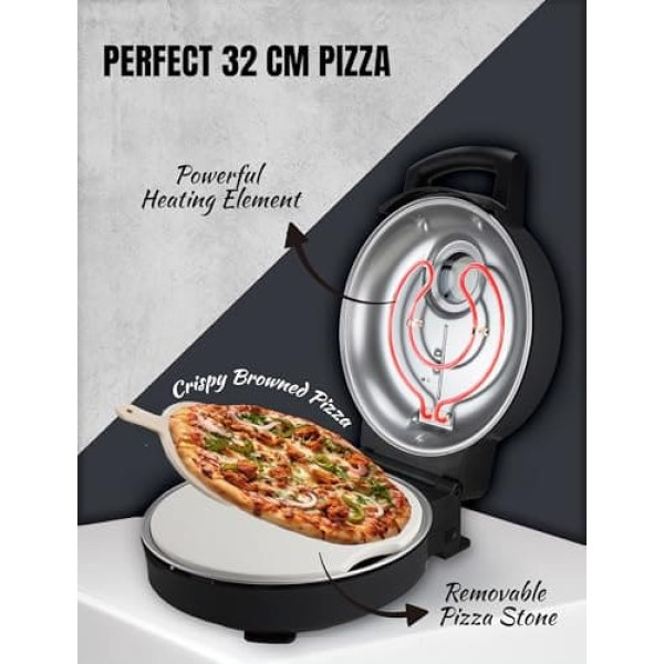 Practical and quick: turbo heating time of approx. 8 minutes up to real 320°C - ideal heat inside for crispy pizza margherita, pepperoni or salami Fireclay stone in the pizza oven: even heat distribution and retention for crispy crust, moisture absorption and protection against burning Includes 2 x wooden pizza peel for effortless removal without burning, infinitely adjustable thermostat Easy to clean: wash the fireclay brick with a damp cloth, fireclay stone can be removed Box contents: 1x Bestron pizza oven, up to real 320°C, infinitely adjustable thermostat and timer, size: 56 x 27 x 39, weight: 5.85 kg, black label collection, APZ500BL, colour: matte black › See more product details