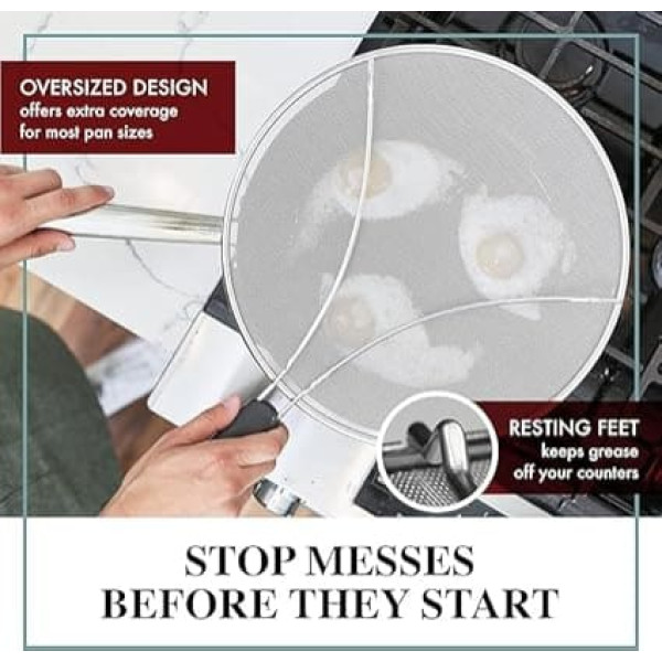 PROTECT FROM HOT SPIT OIL Our oil splatter guard securely connects to the handles of the cookware to protect your hands from painful burns. Forget about hurtful blisters. No more potholders and oven mitts needed. KEEPS STOVE, CABINETS & COUNTERS CLEAN - Tired of removing stains from wall, countertop, fridge, and cabinets? The splash guard for the frying pan is a splash guard that saves you time cleaning and brings you to your food while it is still hot. WORKS WITH MOST COOKWARE Our heavy duty grease splatter guard for frying pan fits most pots, pans and skillets - protecting you and your kitchen from hot oil Reduces kitchen odors. Don't Fly Over Flames - Made of durable stainless steel with an extra fine mesh. Unlike silicone alternatives, this oil splash guard allows the release of steam while stopping 99% of splashes. DISHWASHER SAFE Our splatter guards for frying are dishwasher safe for hassle free cleanup. Stays rust free. Ideal for cutlets, chips, hushpuppies, beignets and burgers. Warm Tips Take the pan off the heat to reduce sizzling when removing this splash guard to flip or stir food. › See more product details; Product description Say goodbye to messy kitchens and painful burns with our 13\; Product description Say goodbye to messy kitchens and painful burns with our 13\; Say goodbye to messy kitchens and painful burns with our 13\