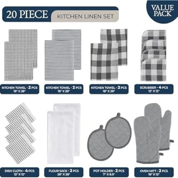 LANE LINEN Kitchen Towels and Dish Towels, 20 Pieces, Kitchen Utensils for New Home, Heat Resistant Oven Mitts and Pot Holders, Absorbent Flour Sack, Dish Towels, Grey