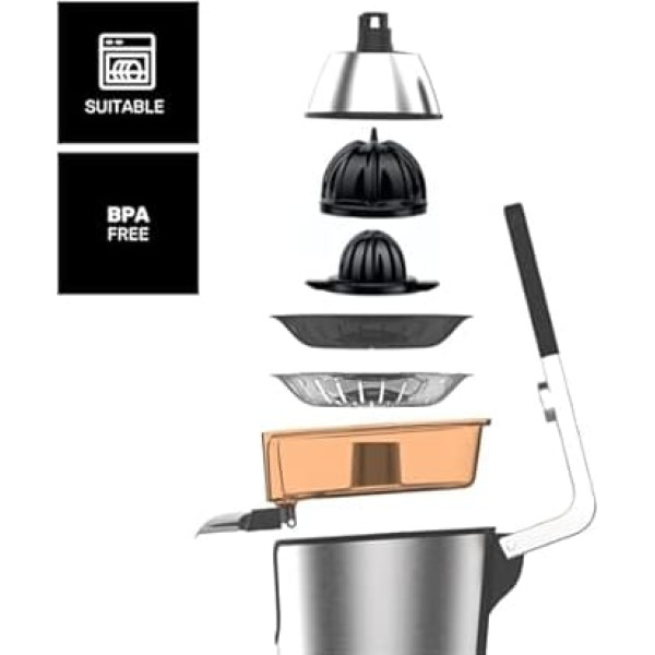 Professional motor with 1000 W power: the powerful 1000 W AC motor ensures fast and efficient juice extraction. Durable stainless steel construction, odourless and fade resistant. Ergonomic and comfortable operation: the soft-touch lever handle allows effortless squeezing without effort. Non-slip suction feet ensure maximum stability. Adjustable fruit pulp filter and double cone: with the adjustable pulp filter, you can determine the juice consistency according to your taste. Includes two press cones for different citrus sizes. Direct pouring or catching: thanks to the stainless steel pouring spout, you can fill the juice directly into the glass or use the 0.65 L juice container. Easy to clean and BPA-free: removable design, dishwasher-safe parts (filter, cone, container). All materials are BPA free and food safe. › See more product details; Product description The Taurus Easy Press 1000 Legend is an electric citrus juicer with lever mechanism and a powerful 1000W AC professional motor that ensures quick and effortless juice extraction. Thanks to the two cone sizes, you can squeeze all citrus fruits - from limes and lemons to oranges and grapefruits - perfectly. The adjustable pulp filter allows you to control the consistency of your juice - with or without pulp. In addition, the continuous pouring function with stainless steel spout ensures that you can fill the juice directly into the glass. The ergonomic lever system with soft-touch handle guarantees easy and comfortable use, while the non-slip suction feet provide maximum stability on the work surface. The fully dismountable construction allows for effortless cleaning - all removable parts are dishwasher safe and BPA free. Thanks to the stainless steel housing, durable filter and drip-free spout, the Easy Press 1000 Legend is ideal for everyday use and a perfect addition to any kitchen.; Product description The Taurus Easy Press 1000 Legend is an electric citrus juicer with lever mechanism and a powerful 1000W AC professional motor that ensures quick and effortless juice extraction. Thanks to the two cone sizes, you can squeeze all citrus fruits - from limes and lemons to oranges and grapefruits - perfectly. The adjustable pulp filter allows you to control the consistency of your juice - with or without pulp. In addition, the continuous pouring function with stainless steel spout ensures that you can fill the juice directly into the glass. The ergonomic lever system with soft-touch handle guarantees easy and comfortable use, while the non-slip suction feet provide maximum stability on the work surface. The fully dismountable construction allows for effortless cleaning - all removable parts are dishwasher safe and BPA free. Thanks to the stainless steel housing, durable filter and drip-free spout, the Easy Press 1000 Legend is ideal for everyday use and a perfect addition to any kitchen.; The Taurus Easy Press 1000 Legend is an electric citrus juicer with lever mechanism and a powerful 1000W AC professional motor that ensures quick and effortless juice extraction. Thanks to the two cone sizes, you can squeeze all citrus fruits - from limes and lemons to oranges and grapefruits - perfectly. The adjustable pulp filter allows you to control the consistency of your juice - with or without pulp. In addition, the continuous pouring function with stainless steel spout ensures that you can fill the juice directly into the glass. The ergonomic lever system with soft-touch handle guarantees easy and comfortable use, while the non-slip suction feet provide maximum stability on the work surface. The fully dismountable construction allows for effortless cleaning - all removable parts are dishwasher safe and BPA free. Thanks to the stainless steel housing, durable filter and drip-free spout, the Easy Press 1000 Legend is ideal for everyday use and a perfect addition to any kitchen.