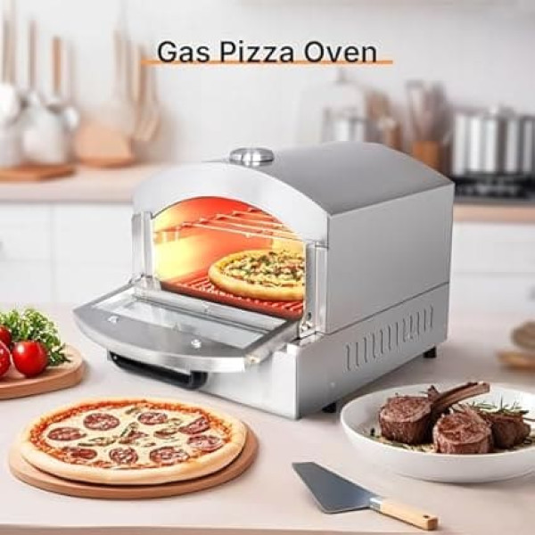 Gas pizza oven, size: 42 x 53 x 41 cm, pressure: low pressure, use: LPG Commercial pizza oven - Machine grade: thick explosion-proof glass, thickened stainless steel body, high temperature and corrosion resistance. PROFESSIONAL PIZZA OVEN DESIGN - Anti-scald, positioning card slot, temperature pointer, temperature controller, double layer grill, can be used at the same time, with removable top grill HEAT TO 350 C - Even heating, able to raise the temperature quickly, make your food fully cooked in 3 minutes. Pizza oven - suitable for families and restaurants, it can make delicious baked pizzas, chicken wings, grilled meat, baked cakes and even cakes. › See more product details; Product description Commercial gas pizza oven with temperature pointer and gas regulator; Product description Commercial gas pizza oven with temperature pointer and gas regulator; Commercial gas pizza oven with temperature pointer and gas regulator