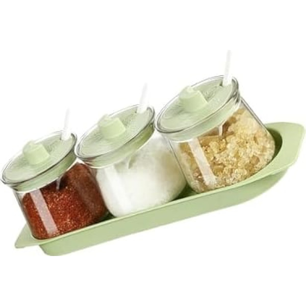 Docache Kitchen Spice Set with Tray - Clear Spice Container with Lid and Spoon - Kitchen Condiment, Salt, Sugar and Condiment Organization Set, 3 Pieces (Green)