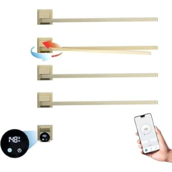 Electric towel warmer: Our heated towel rail is equipped with 4 bars + 1 main switch. Our rack is made of 304 stainless steel and is equipped with a coated surface that is corrosion resistant, IPX4 waterproof and durable 180° rotating radiator: wall mounted towel warmer, 180°. Flexible and even rotation, quiet and dry, make full use of the space. For small family toilets and bathrooms, 4-bar towels dry faster Intelligent touch screen control: Heated towel rail with LED indicator. Timing function (timed shut-off function: 1-24 hours, on/off button long press for 3 seconds to turn on/off ), temperature control of the heater (temperatures: 45℃-60℃) increases by 5° with each press of the button Intelligent WiFi control: Download the \