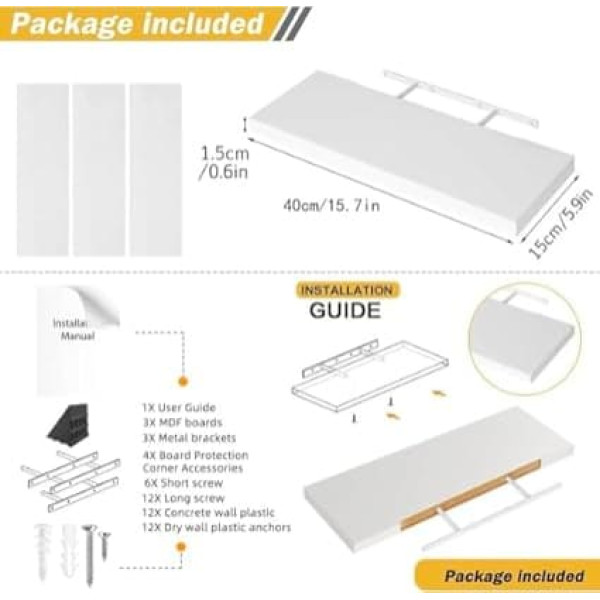 Beautiful MDF board: Floating wooden shelves made of environmentally friendly MDF wood, so they feel smooth and have a solid feel with superior durability. GROUPING KIT WITH FLOATING SHELVES Provides you with freestyle decor design and expands storage space. The perfect decoration starts with this wall shelf to display book frames, collectibles, vases, crafts, trophies in living room, office. Enjoy improved aesthetics. SIMPLE AND STYLISH Combines elegance with durability, versatility, and functionality needed by today's home decor. This functional wall shelf complements various decoration styles. Buy two or three together to fill a blank wall and turn it into a great place to store and display your belongings EASY TO INSTALL Wall mounting hardware is included, so you can install this floating wall shelf as soon as it arrives. The streamlined silhouette gives it an acontemporary look and shows no visible support, making it appear floating Customer Service:As a responsible seller, customer satisfaction is our goal. If you have any questions or suggestions, please let us know, we will be happy to solve them for you. Our mission is to help you free up space in your favorite house › See more product details