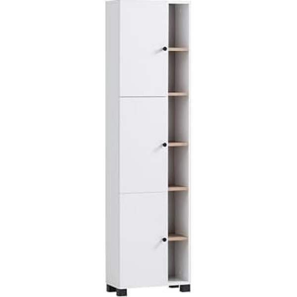 Dimensions: approx. 44.9 x 23.4 x 167.6 cm (W x D x H) Tall cabinet with 3 doors and 6 open compartments, 1 height-adjustable shelf behind the doors Open compartments can be mounted on the left or right of the cabinet, shelves in wild oak decoration Doors with stop damping, door hinge always on the outside Compartment dimensions behind the doors: 27 x 19.6 x 25 cm (W x D x H), compartment dimensions open compartments: each 18.4 x 19.6 x 25 cm (W x D x H) Handles in matt black made of metal, fittings made of metal Feet in matt black made of plastic. Height approx. 4.5 cm Also ideal for particularly narrow bathrooms Easy to assemble with understandable assembly instructions (English language not guaranteed), made in Germany Show More › See more product details