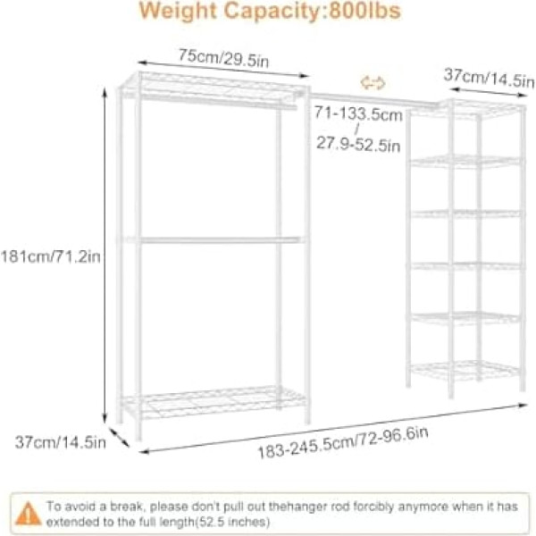 Dimensions: 185-245 cm x 37 cm x 180 cm / 185.0-245.0 cm x 14.57 inches x 70.87 inches Telescopic rod - The middle hanging rod is expandable, the total length of the durable clothes rack can be extended from 185 cm to 245 cm, which provides more space for hanging clothes. Easy access to bedroom, cloakroom, clothes shop, laundry room, walk-in wardrobe... STURDY CONSTRUCTION This wardrobe is made of high quality carbon steel, make sure it is sturdy and durable. The powder coated surface protects the coat rack from rust. Each shelf holds up to 30 kg, maximum load capacity is 240 kg. Each hanging bar can hold up to 20 kg ADJUSTABLE & REMOVABLE SHELVES You can conveniently adjust the shelf height by the slip sleeve locking system, easily adjust the shelf to the proper height you need to store items. Due to this, it is also available to remove the shelf if you don't need many Coat rails with spacious space: KZOBYD coat stand design with 8 shelves and 3 hanging rails that offers plenty of space for your clothes and items. The shelf is 2 large and 6 small, ideal for bedding, shoes, boxes...3 hangers are perfect for any clothes from short to long Easy to assemble: freestanding clothes rack, no tools required, each package includes detailed installation instructions. Please read and check the parts quantity before assembling › See more product details; Product description clothes rails clothing rail clothing garment rack coat racks wardrobe closet rack with hanging rods adjustable shelves and storage clothes rail clothing rails for hanging clothes clothing rack garment rack; Product description clothes rails clothing rail clothing garment rack coat racks wardrobe closet rack with hanging rods adjustable shelves and storage clothes rail clothing rails for hanging clothes clothing rack garment rack; clothes rails clothing rail clothing garment rack coat racks wardrobe closet rack with hanging rods adjustable shelves and storage clothes rail clothing rails for hanging clothes clothing rack garment rack