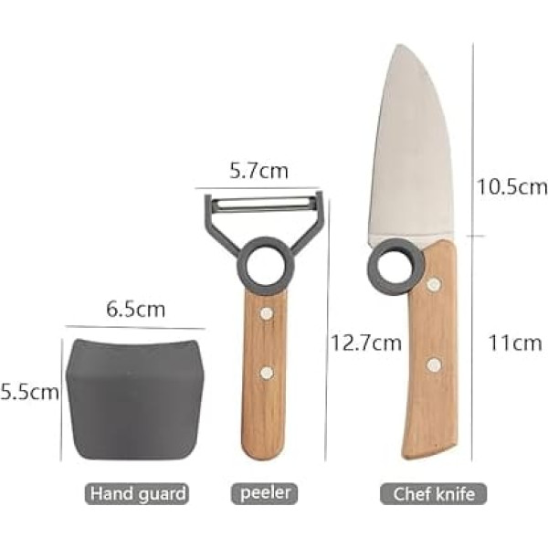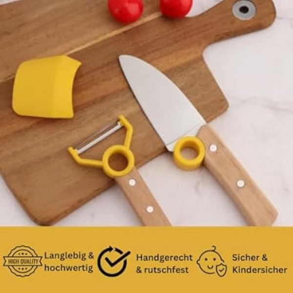 CHILD SAFE DESIGN: Rounded tips and safety handles minimize the risk of injury. Specially designed for safe use by children. HIGH QUALITY MATERIALS - Rust-proof stainless steel for durability. Natural wood handles for a comfortable feel and secure grip. Durable plastic for finger protector. ERGONOMIC & LIGHTWEIGHT: Lightweight tools specially designed for children's little hands. Easy to use to develop motor skills. Promote self-reliance and learning skills: supports the development of fine motor skills, concentration and self-confidence. Perfect for introducing children to the kitchen in a creative way. FUN & EDUCATION COMBINED - Educational accessories that arouse interest in cooking and healthy eating. Makes cooking with family a fun and safe experience. › See more product details