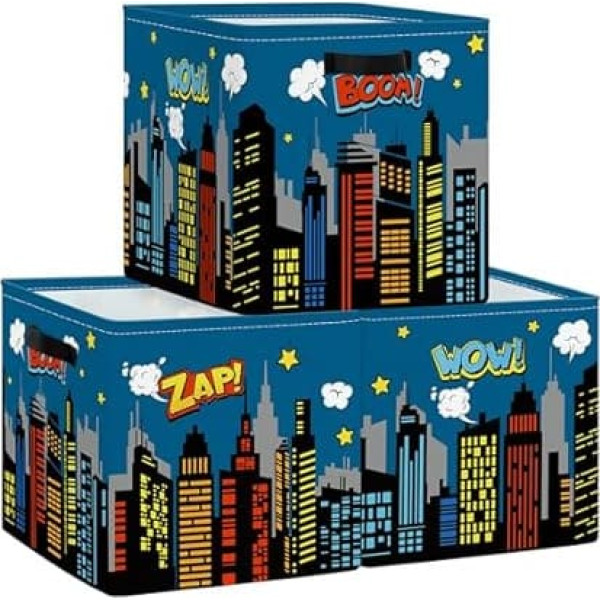 Clastyle Pack of 3 Cityscape Hero Children's Storage Box Skyline Building Fabric Boys Girls Storage Basket with Handles Toy Storage Cube Organiser for Books Clothes Comic 30 x 30 x 30 cm