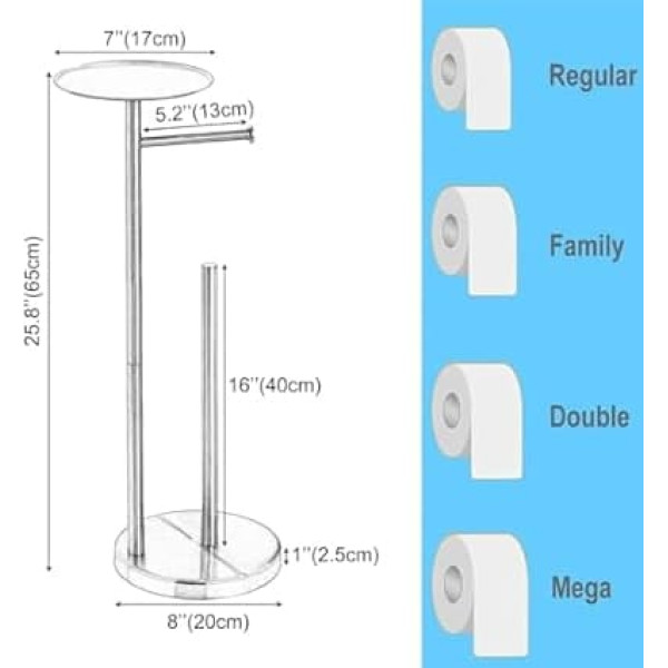 Never run out of toilet paper again: The NEWRAIN freestanding toilet paper holder keeps your bathroom in stock and organized. No more last-minute confusion - it keeps one roll ready for use and three additional wheels neatly tucked underneath. If necessary, simply swap in a fresh roll and you're ready to go. STURDY AND STURDY - NO SLIPPING, NO SCRATCHES A weighted base with a non-slip pad keeps this holder firmly in place, even on tile or hardwood. The raised shelf design keeps replacement rollers off the floor and protects them from moisture and dirt. DURABLE & RUST PROOF Stainless steel toilet paper holder with an elegant brushed gold finish, this holder resists rust, scratches and daily wear and tear. A quick wipe with a damp cloth will keep them looking new - no tarnishing over time. BONUS STORAGE RACK - MORE THAN JUST TP: The handy top shelf holds phones, e-readers, tampons or a spare pack of wet wipes. Perfect for keeping essentials within reach while you are busy. FREE TOOL - 5 MINUTE SETUP Everything you need comes in the box. Just follow the simple illustrated instructions - no frustration, no extra tools. › See more product details; Product description Specifications: Materials: SUS304 Stainless Steel Finish: Brushed Gold Mounting type: freestanding. Max. Roll length: 5.9 inches (150 mm). Overall Height: 580mm; Product description Specifications: Materials: SUS304 Stainless Steel Finish: Brushed Gold Mounting type: freestanding. Max. Roll length: 5.9 inches (150 mm). Overall Height: 580mm; Specifications: Materials: SUS304 Stainless Steel Finish: Brushed Gold Mounting type: freestanding. Max. Roll length: 5.9 inches (150 mm). Overall Height: 580mm