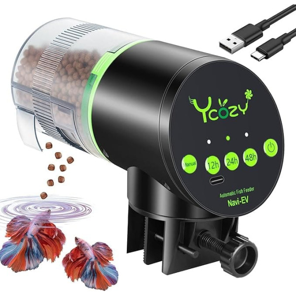 USB rechargeable: upgraded rechargeable. You no longer have to insert batteries and no longer worry about lack of battery power. It lasts 3-6 months. LED lights remind you of a lack of battery power. Full charge takes 3 hours and it can be used while charging. Super easy setting: compared to other fish feeders, Navi-EV is easier to use. 3 buttons 12/24/48 represent one turn every 12/24/48 hours. Ultra-quiet when turning, stay away from noise. Add the fish food at the top without having to remove the feed bucket, very convenient. LED light indicator: equipped with LED indicator lights, you can easily check the battery power. Green light turns on after it is fully charged, and red light flashes when there is no power. With the 360° rotating clamp, you can adjust the position. 15 levels adjustable: the moisture-resistant funnel keeps the fish food dry and it does not get wet or jammed. It absorbs most types of food, including flakes, pellets, powders and strips. 15 outlet levels for independent control of the outlet size and fine adjustment of the amount of food to prevent overfeeding. Ycozy guarantee: fits 600L aquarium. Order and receive: 12 months warranty, Navi-EV fish feeder x 1, clamp x 1, type C charging cable x 1, double-sided acrylic tape x 1, instruction manual x 1. › See more product details