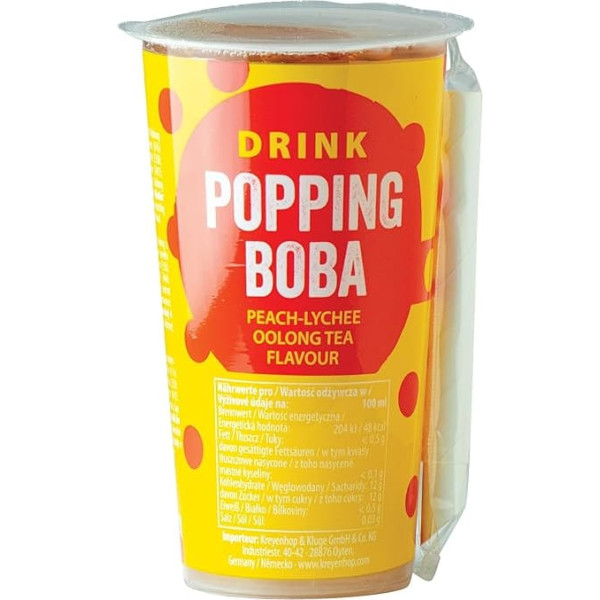 OBOBA Popping Boba Drink, Peach and Lychee Oolong Country of origin: Taiwan Box contents: 1 x 425 ml › See more product details; Product description Product Description OBOBA Popping Boba Drink, Peach and Lychee Oolong, disposable deposit DPG, country of origin: Taiwan, box contents: 1 x 425 ml. Ingredients Ingredients: water, sugar, filled beads (6%) (water, fructose, acidity regulator: E327; acidifier: E330; corn starch, thickener: E401, E466; stabilizer: E415; firming agent: E509), fructose, peach lychi flavour, oolong tea. Regulators: E296, E331. Manufacturer Contact Information Industriestr. 40-42, 28876 Oyten, Germany / Německo See more; Product description Product Description OBOBA Popping Boba Drink, Peach and Lychee Oolong, disposable deposit DPG, country of origin: Taiwan, box contents: 1 x 425 ml. Ingredients Ingredients: water, sugar, filled beads (6%) (water, fructose, acidity regulator: E327; acidifier: E330; corn starch, thickener: E401, E466; stabilizer: E415; firming agent: E509), fructose, peach lychi flavour, oolong tea. Regulators: E296, E331. Manufacturer Contact Information Industriestr. 40-42, 28876 Oyten, Germany / Německo See more; Product Description OBOBA Popping Boba Drink, Peach and Lychee Oolong, disposable deposit DPG, country of origin: Taiwan, box contents: 1 x 425 ml. Ingredients Ingredients: water, sugar, filled beads (6%) (water, fructose, acidity regulator: E327; acidifier: E330; corn starch, thickener: E401, E466; stabilizer: E415; firming agent: E509), fructose, peach lychi flavour, oolong tea. Regulators: E296, E331. Manufacturer Contact Information Industriestr. 40-42, 28876 Oyten, Germany / Německo See more