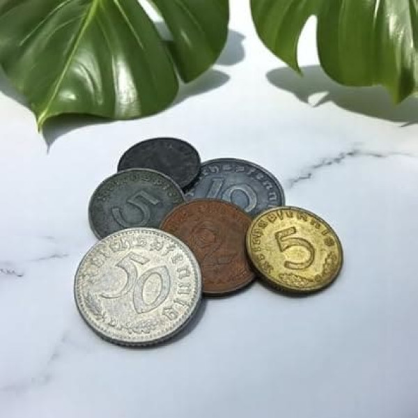 Authentic World War II coins Collection of 6 original coins from the greatest world war of the 20th century. A piece of history in your hands. Coins depicting the Imperial Eagle. Certificate of Authenticity All coins are authentic coins of the time of very good quality and preservation, which guarantees their high collector's value. The certificate of authenticity is included. All coins are housed in an elegant velvet bag and are provided with a brief description of the coins in the collection. A great way to start collecting antique coins, and the perfect gift for collectors. › See more product details