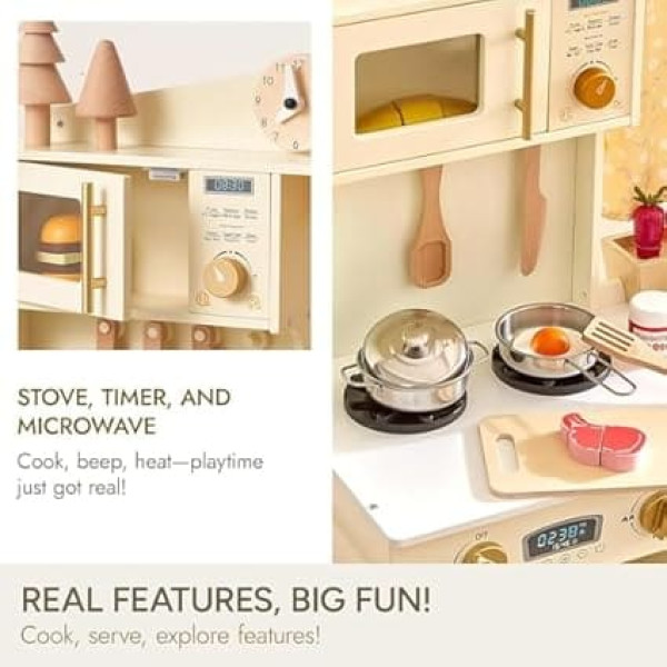 Cute and fun play kitchen for children: the toy kitchen in modern giant bean style is exquisitely designed and equipped with many exciting functions, an ice cream maker dispenses ice cubes, a planter with cuttable carrots and a board as well as cute small curtains. Together with 5 cookware. The package includes 3 ice cubes and 1 plastic cup, children will have lots of fun cooking! Premium quality and safe for children to play: This children's kitchen playset is made of polished natural wood and water-based paints, BPA-free. Thanks to the smooth surface and round edges, the set is safe for small children to play. It is fully tested to the highest US ASTM F 963-11 and European EN71 toy safety standards. Adjustable height and special working space: the wooden kitchen has 3 heights. Simply add one of the sides of the extendable feet. The play kitchen is comfortable for children aged 2 to 5 years. We have carefully designed the stove area so that children have enough space to work so that they can cut, cook and bake without obstacles Learn through play: This wooden play kitchen promotes children's attention development and improves their hand-eye coordination, social skills and many other skills. Through cooking games, they can gradually learn the names of different ingredients and familiarize themselves with cooking processes. Parents can encourage their children to develop passion for life through cooking together and develop healthy eating habits! Great gift for toddlers: This premium play kitchen is modern and stylish and at the same time very compact to save space. It can easily captivate children and create plenty of time for off-screen entertainment. For children aged 2 to 5 years, it is an ideal Christmas or birthday gift and also a perfect educational toy. › See more product details