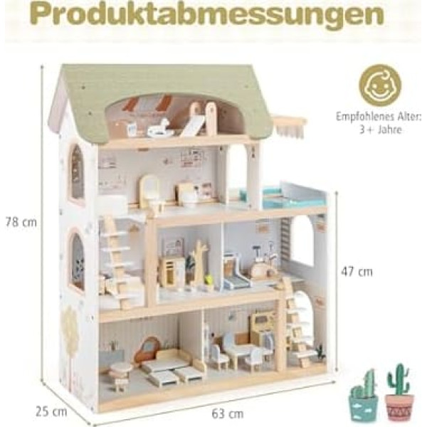 Versatile room design: this attractive dollhouse includes a living room, kitchen, bedroom, home gym, bathroom, children's room and a balcony with pool. Enter a mini modern home for imaginative role play! 33 pieces of furniture: With 33 cute toy furniture, the dollhouse allows children to explore their architectural talents by arranging these pieces in different ways. The rich accessories stimulate imagination and creativity for endless fun. Sturdy wooden frame: Made of high-quality MDF and pine wood, this dollhouse offers a safe and stable structure, free from unpleasant odours. The chip-free surface with rounded corners makes it a safe place for playful adventures. Versatile advantages: this wooden dollhouse is not only a source of fun, but also a tool for development. It improves fine motor skills, cognitive skills and emotional understanding through joyful and educational play. Ideal for 2+ years: Decorated with attractive patterns that stimulate young imagination, the doll villa is ideal for children aged 3 and over. It is an excellent gift that promotes creativity and family ties. › See more product details; Product description Product description Description: Welcome to a world full of imagination and wonder with this charming dollhouse! Designed to ignite children's creativity, this adorable playhouse includes different spaces such as living room, kitchen and even a balcony with pool. 33 cute pieces of furniture are included for endless fun. Perfectly made of high-quality wood, the doll villa ensures a safe and joyful play environment. Not just for playing, this dollhouse with thoughtful details is the ideal gift to spark creativity and promote family bonds. Let your child experience unforgettable moments of joy and learning! Features: Interactive modern dollhouse with a variety of interior designs. Contains 33 pieces of furniture to furnish different rooms. Movable stairs bring children more fun Robust wooden structure for long-lasting stability. Smooth surface with rounded corners for added safety Perfect tool to promote the holistic development of children Suitable for children over 3 years Technical data: Colour: light green. Material: MDF, pine wood. Overall dimensions: 63 x 25 x 78 cm (L x W x H). Net weight: 7 kg. Recommended age: 3+ years. Box contents: 1 x dollhouse. 33 x toy furniture. 1 x instruction manual Safety Warning /; Product description Product description Description: Welcome to a world full of imagination and wonder with this charming dollhouse! Designed to ignite children's creativity, this adorable playhouse includes different spaces such as living room, kitchen and even a balcony with pool. 33 cute pieces of furniture are included for endless fun. Perfectly made of high-quality wood, the doll villa ensures a safe and joyful play environment. Not just for playing, this dollhouse with thoughtful details is the ideal gift to spark creativity and promote family bonds. Let your child experience unforgettable moments of joy and learning! Features: Interactive modern dollhouse with a variety of interior designs. Contains 33 pieces of furniture to furnish different rooms. Movable stairs bring children more fun Robust wooden structure for long-lasting stability. Smooth surface with rounded corners for added safety Perfect tool to promote the holistic development of children Suitable for children over 3 years Technical data: Colour: light green. Material: MDF, pine wood. Overall dimensions: 63 x 25 x 78 cm (L x W x H). Net weight: 7 kg. Recommended age: 3+ years. Box contents: 1 x dollhouse. 33 x toy furniture. 1 x instruction manual Safety Warning /; Product description Description: Welcome to a world full of imagination and wonder with this charming dollhouse! Designed to ignite children's creativity, this adorable playhouse includes different spaces such as living room, kitchen and even a balcony with pool. 33 cute pieces of furniture are included for endless fun. Perfectly made of high-quality wood, the doll villa ensures a safe and joyful play environment. Not just for playing, this dollhouse with thoughtful details is the ideal gift to spark creativity and promote family bonds. Let your child experience unforgettable moments of joy and learning! Features: Interactive modern dollhouse with a variety of interior designs. Contains 33 pieces of furniture to furnish different rooms. Movable stairs bring children more fun Robust wooden structure for long-lasting stability. Smooth surface with rounded corners for added safety Perfect tool to promote the holistic development of children Suitable for children over 3 years Technical data: Colour: light green. Material: MDF, pine wood. Overall dimensions: 63 x 25 x 78 cm (L x W x H). Net weight: 7 kg. Recommended age: 3+ years. Box contents: 1 x dollhouse. 33 x toy furniture. 1 x instruction manual Safety Warning /