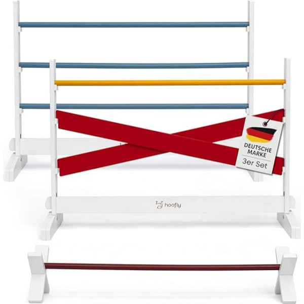 Creative hobby horse accessories - With the Hoofly Hobby Horse obstacle set (2 steep jumps + 1 cavaletti), children design their own course. Exciting hobby horse jumps for a real tournament feeling at home. Stable and safe hobby horse hurdles - Made of high-quality wood, tested according to EN 71 toy safety standard. Robust, tilt-proof hobby horsing accessory for carefree fun. Dimensions: steep jump 90 x 62 x 32 cm, Cavaletti 32 x 90 x 32 cm. Quick to set up - Thanks to the practical plug-in system, the obstacles for children can be set up to jump in minutes. Ideal hobby horsing obstacles for the garden, children's room or for hobby horse tournaments. Promotes creativity and movement - The Hoofly obstacles encourage children to invent new obstacle courses and increase their joy of movement. Children's hurdles for hobby horse & hobbyhorse accessories - versatile indoor & outdoor use. Space-saving and versatile - After playing, the hurdles hobby horsing can be easily stowed away. Perfect for home or on the go - an ideal hobby horse gift for horse enthusiastic children. › See more product details