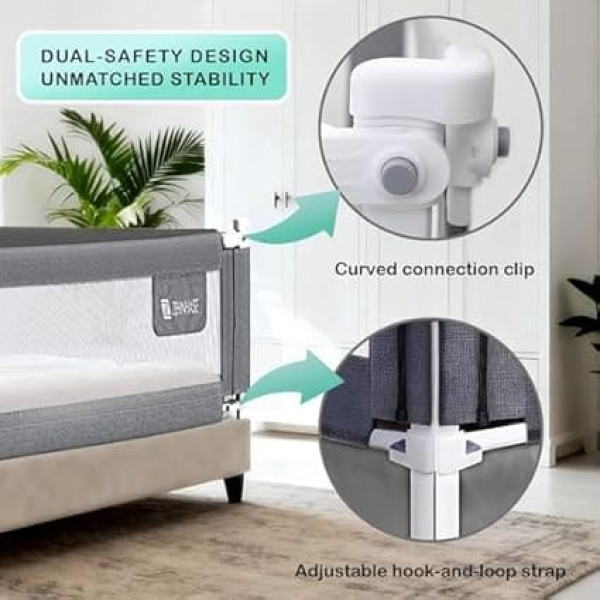 - Easy to install: The bed rail has a vertical design that can be raised up and down freely, leaves no spaces, comfortable and fast. The bed rail must be screwed to the frame, ensuring the safety of children. Not recommended for use on platforms or similar beds. - Safe and secure: Reinforced safety splices, new L-shaped connection, safer, anti-oscillation, the bed rail is made of eco-friendly materials, will not harm your baby, high-density round parts, effectively reduces shattering. - Safe sleep: Raise the child's anti-crash barrier vertically to prevent the child from rolling and accidentally falling off the bed. Mum can do her own thing with confidence. - Adjustable height: The height of new bed rail can be freely adjusted depending on the thickness of the mattress. The lifting bar can be lowered onto the bed surface to make sitting on the bed easier. It is suitable for most bed types. - - › See more product details