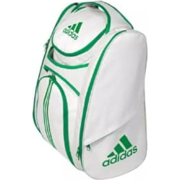 Product description El paletero adidas Multigame blanco y verde está dirigido tanto a jugadoras como jugadores de edad adulta, sin importar la destreza que hayan adquirido en el pádel. Ofrece suficiente capacidad para albergar diez palas. Su estructura está dividida en compartimentos de diferentes dimensiones. El bolsillo principal sirve para guardar palas, protegerlas de golpes y cambios repentinos de temperatura. También incluye un bolsillo central con ventilación, ideal para depositar los zapatos. Presenta dos bolsillos laterales en los que se pueden guardar otros accesorios de dimensiones intermedias, así como otros bolsillos de menor tamaño. Todos estos compartimentos están asegurados con un eficaz sistema de cierre en cremallera. El paletero ha sido fabricado exclusivamente con poliéster para conseguir una confección resistente al uso, a la vez que ligera. Está pensado para llevarse cómodamente gracias a las asas ajustables. A nivel estético, su superficie se encuentra bañada por una uniforme distribución de color blanco sobre la que se superponen puntuales incursiones de verde para resaltar los signos distintivos de la marca, así como los cierres de cremallera. No se han incluido motivos decorativos llamativos para no limitar sus posibilidades de combinación.; Product description El paletero adidas Multigame blanco y verde está dirigido tanto a jugadoras como jugadores de edad adulta, sin importar la destreza que hayan adquirido en el pádel. Ofrece suficiente capacidad para albergar diez palas. Su estructura está dividida en compartimentos de diferentes dimensiones. El bolsillo principal sirve para guardar palas, protegerlas de golpes y cambios repentinos de temperatura. También incluye un bolsillo central con ventilación, ideal para depositar los zapatos. Presenta dos bolsillos laterales en los que se pueden guardar otros accesorios de dimensiones intermedias, así como otros bolsillos de menor tamaño. Todos estos compartimentos están asegurados con un eficaz sistema de cierre en cremallera. El paletero ha sido fabricado exclusivamente con poliéster para conseguir una confección resistente al uso, a la vez que ligera. Está pensado para llevarse cómodamente gracias a las asas ajustables. A nivel estético, su superficie se encuentra bañada por una uniforme distribución de color blanco sobre la que se superponen puntuales incursiones de verde para resaltar los signos distintivos de la marca, así como los cierres de cremallera. No se han incluido motivos decorativos llamativos para no limitar sus posibilidades de combinación.; El paletero adidas Multigame blanco y verde está dirigido tanto a jugadoras como jugadores de edad adulta, sin importar la destreza que hayan adquirido en el pádel. Ofrece suficiente capacidad para albergar diez palas. Su estructura está dividida en compartimentos de diferentes dimensiones. El bolsillo principal sirve para guardar palas, protegerlas de golpes y cambios repentinos de temperatura. También incluye un bolsillo central con ventilación, ideal para depositar los zapatos. Presenta dos bolsillos laterales en los que se pueden guardar otros accesorios de dimensiones intermedias, así como otros bolsillos de menor tamaño. Todos estos compartimentos están asegurados con un eficaz sistema de cierre en cremallera. El paletero ha sido fabricado exclusivamente con poliéster para conseguir una confección resistente al uso, a la vez que ligera. Está pensado para llevarse cómodamente gracias a las asas ajustables. A nivel estético, su superficie se encuentra bañada por una uniforme distribución de color blanco sobre la que se superponen puntuales incursiones de verde para resaltar los signos distintivos de la marca, así como los cierres de cremallera. No se han incluido motivos decorativos llamativos para no limitar sus posibilidades de combinación.