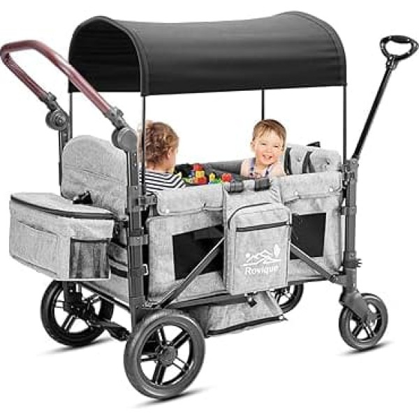 Comfortable experience: your child can rest comfortably on outdoor adventures. Whether you are strolling through the park or taking a long journey, this handcart provides a comfortable and safe experience for your little one. LIGHTWEIGHT & DURABLE Unlike iron frame hand carts, we use premium aircraft grade aluminum which is extra durable and lightweight. With its sturdy, durable design that can withstand everyday use, this stroller is a reliable choice for families. Highest comfort and safety: Rovique handcart has been developed for a smooth ride and is equipped with high-quality PU wheels and a quality suspension that ensures excellent shock absorption on different terrain, from asphalt to sand. The single-stage foot brake provides extra safety and gives parents full control to stop safely. Stroller with canopy: The sliding and removable canopy protects the child from sun and rain. Equipped with a five-point harness and a generous footwell, it is perfect for the beach, park, camping and much more. Conventional and practical design: this handcart for 2 children can be easily converted into a shopping cart for travel and daily shopping, where all the essentials for your child can be stored. It also features a removable snack tray, two side pockets and an extra large storage bag. MORE VERSATILITY The quick fold design fits in most trunks making it a must have for family travel. It is also the perfect gift for birthdays, Christmas and new parents. › See more product details