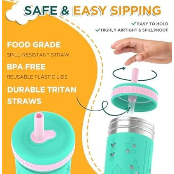 VIBRANT AND ATTRACTIVE DESIGN Each kids mug comes with a removable non slip silicone sleeve in a fun and colorful design. The sleeves feature cute patterns that add a playful touch that kids will love while providing a secure fit. Safe and functional lid: The lids of these sippy cups come with a soft silicone spout and a sturdy plastic straw. The screw thread design ensures a tight seal, and the silicone spout allows for easy carrying without fear of falling off. The anti-spill feature includes an internal valve in the straw that controls fluid flow and prevents leaks when the cup is turned over. Kid-friendly features: Our children's cups are equipped with a soft, comfortable silicone straw that is gentle on young mouths. The built-in valve ensures leak-proof drinking, making them ideal for children. These versatile cups are perfect for enjoying milk, juice, smoothies and water. Easy maintenance: all components of these stainless steel cups are removable, making them easy to clean by hand or in the dishwasher. Please note that these mugs are not microwave safe, so avoid using them in the microwave. High-quality and lightweight material: this set includes four 10-ounce toddler cups made of high-quality 18/8 stainless steel. They are lightweight yet durable to ensure they are shatterproof and perfect for young children who might fall them. › See more product details; Product description Tronco 2 Pack Stainless Steel Toddler Tumblers 10oz Smoothie Cups with Silicone Sleeves and Straws Leak Proof BPA Free; Product description Tronco 2 Pack Stainless Steel Toddler Tumblers 10oz Smoothie Cups with Silicone Sleeves and Straws Leak Proof BPA Free; Tronco 2 Pack Stainless Steel Toddler Tumblers 10oz Smoothie Cups with Silicone Sleeves and Straws Leak Proof BPA Free