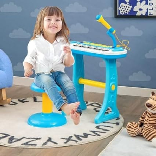 Multifunctional children's keyboard: our children's keyboard offers 22 demos, 8 adjustable volumes, 8 tones, 7 rhythms and 4 drum instruments to give children the opportunity to design their own music. The realistic keyboard provides a fun gaming experience, while the side speakers allow children to hear the music clearly. Flashing lights and automatic switch-off: 4 flashing light rhythms provide additional fun. The keyboard also has an automatic shut-off function: if no key is pressed for more than 3 minutes, it automatically turns off and can be switched on again by pressing any key. Note: Batteries (4 AA) are required but not included. Adjustable microphone and stool: the angle adjustable microphone provides extra singing fun. It can be rotated up to 90 degrees up or down and 360 degrees to adapt to the height of the child. A sturdy stool ensures comfortable sitting and offers a high load capacity. Lightweight and portable design: the lightweight keyboard can be easily removed from the stand. With a convenient handle, children can easily carry it and enjoy the music throughout the house. In addition, the compact keyboard can be easily stored after removing the stand. Ideal gift from 3 years: Our cute keyboard is an ideal gift for children aged 3 and over. It not only provides fun, but also promotes musical development. This educational toy supports IQ cultivation, memory training, hearing development and hand-eye coordination in children. › See more product details; Product description Product Description Description: This fun and educational keyboard set will quickly become your child's favourite instrument. It offers fun for children aged 3 and up and has 22 demos, 8 adjustable volumes, 8 different tones, 7 rhythms and 4 drum instruments. The microphone can be adjusted to the size of the children and provides hours of fun. When the children get tired, they can sit comfortably on the round stool. In addition, the top keyboard can be removed to easily transport it from the living room to the children's room. This keyboard is not only a fun toy, but also a valuable musical instrument for promoting IQ, training memory and developing hearing. Features: Designed with 22 demos, 8 adjustable volumes, 8 tones, 7 rhythms and 4 drum instruments 4 rhythms of flashing lights for more joy Automatic shut-off function extends battery life Realistic buttons to train the flexibility of baby's fingers Adjustable microphone for singing fun Extra stool with sturdy base for children to rest Portable design and light weight for easy carrying and storage. Perfect for IQ cultivation, memory training, hearing development and hand-eye coordination Technical data: Colour: blue/pink. Material: PP. Overall dimensions: 45 cm x 23 cm x 45 cm (L x W x H). Stool Size: 24cm x 24cm (D x H) Suitable age: from 3 years Battery: 4 x AA batteries, not included Net weight: 1.5 kg. Box contents: 1 x 31-key keyboard for children. 1 x microphone. 1 x stool. 1 x instruction manual Safety Warning /; Product description Product Description Description: This fun and educational keyboard set will quickly become your child's favourite instrument. It offers fun for children aged 3 and up and has 22 demos, 8 adjustable volumes, 8 different tones, 7 rhythms and 4 drum instruments. The microphone can be adjusted to the size of the children and provides hours of fun. When the children get tired, they can sit comfortably on the round stool. In addition, the top keyboard can be removed to easily transport it from the living room to the children's room. This keyboard is not only a fun toy, but also a valuable musical instrument for promoting IQ, training memory and developing hearing. Features: Designed with 22 demos, 8 adjustable volumes, 8 tones, 7 rhythms and 4 drum instruments 4 rhythms of flashing lights for more joy Automatic shut-off function extends battery life Realistic buttons to train the flexibility of baby's fingers Adjustable microphone for singing fun Extra stool with sturdy base for children to rest Portable design and light weight for easy carrying and storage. Perfect for IQ cultivation, memory training, hearing development and hand-eye coordination Technical data: Colour: blue/pink. Material: PP. Overall dimensions: 45 cm x 23 cm x 45 cm (L x W x H). Stool Size: 24cm x 24cm (D x H) Suitable age: from 3 years Battery: 4 x AA batteries, not included Net weight: 1.5 kg. Box contents: 1 x 31-key keyboard for children. 1 x microphone. 1 x stool. 1 x instruction manual Safety Warning /; Product Description Description: This fun and educational keyboard set will quickly become your child's favourite instrument. It offers fun for children aged 3 and up and has 22 demos, 8 adjustable volumes, 8 different tones, 7 rhythms and 4 drum instruments. The microphone can be adjusted to the size of the children and provides hours of fun. When the children get tired, they can sit comfortably on the round stool. In addition, the top keyboard can be removed to easily transport it from the living room to the children's room. This keyboard is not only a fun toy, but also a valuable musical instrument for promoting IQ, training memory and developing hearing. Features: Designed with 22 demos, 8 adjustable volumes, 8 tones, 7 rhythms and 4 drum instruments 4 rhythms of flashing lights for more joy Automatic shut-off function extends battery life Realistic buttons to train the flexibility of baby's fingers Adjustable microphone for singing fun Extra stool with sturdy base for children to rest Portable design and light weight for easy carrying and storage. Perfect for IQ cultivation, memory training, hearing development and hand-eye coordination Technical data: Colour: blue/pink. Material: PP. Overall dimensions: 45 cm x 23 cm x 45 cm (L x W x H). Stool Size: 24cm x 24cm (D x H) Suitable age: from 3 years Battery: 4 x AA batteries, not included Net weight: 1.5 kg. Box contents: 1 x 31-key keyboard for children. 1 x microphone. 1 x stool. 1 x inst
