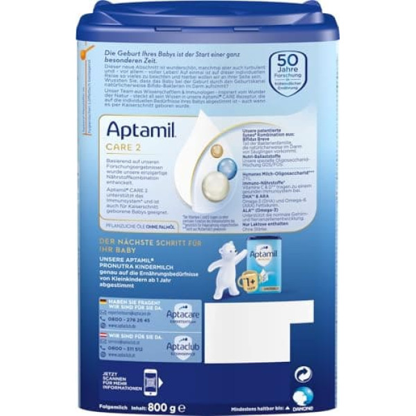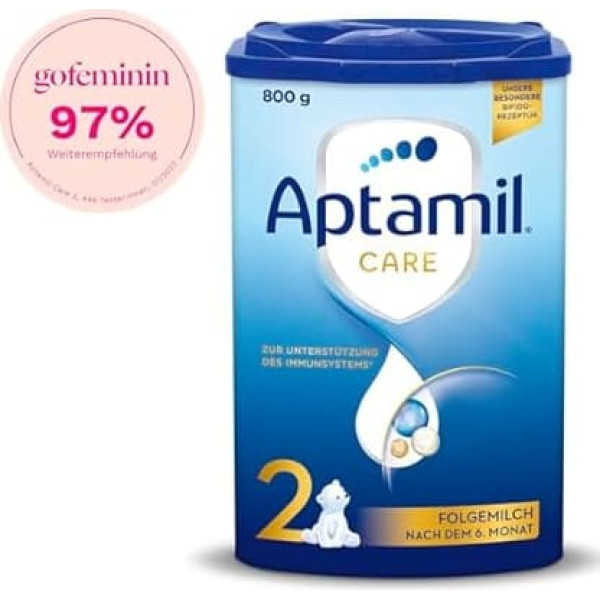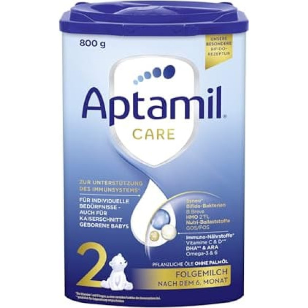 Your milk moments are as individual as you: Aptamil offers high-quality starting and follow-up milks as well as services that are tailored to your needs Care follow-up milk: our special milk with bifido cultures - also babies born for caesarean section. After the 6th Month, ideal for complementary food Patented synneo complex: contains Bifidus Breve, a family of bacteria naturally found in the intestines of infants, and the nutri-fibre GOS/FOS With our GOS/FOS 9:1 fibre blend: and all important nutrients, such as vitamin C* & D* and DHA*. *legally required for follow-on food INSPIRED BY 50 YEARS OF MOTHER MILK RESEARCH Our advanced formula with patented formula draws all our knowledge from many years of research. Our products are also suitable in combination with breast milk › See more product details; Product description Product Description The birth of your baby is the start of a very special time. This new section is beautiful, but sometimes turbulent and - most importantly - full of life! Suddenly, there is so much to consider on this individual journey and here we want to be by your side. Did you know that the baby naturally absorbs bifido bacteria in the intestine through the birth canal at birth? Our team of scientists and immunologists - inspired by the wonder of nature - puts all his knowledge into our Aptamil Care formula, which is tailored to the individual needs of your baby - even if it was born by caesarean section. Aptamil CARE 2 Based on our research results, our unique nutrient combination has been developed. Aptamil CARE 2 supports the immune system* and is also suitable for babies born with caesarean section. Our patented Syneo combination of: Bifidus Breve is part of the bacterial family that occurs naturally in the intestines of infants. Nutri-Ballaststoffe Our special oligosaccharide blend GOS/FOS. Human milk oligosaccharide*** 2'FL immuno nutrients* vitamins C & D** contribute to a healthy immune system. DHA** & ARA Omega-3 (DHA) and Omega-6 (ARA) fatty acids. ALA** (Omega-3) supports normal brain and nerve cell development. Only lactose contains. No starch. Vegetable oils without palm oil. Vitamins C and D contribute to the normal functioning of the immune system. **required by law for follow-on formula ***not derived from breast milk Ingredients Ingredients: lactose (from milk), vegetable oils (sunflower, coconut, rapeseed oil) (23%), whey product (from milk), skimmed milk, galactooligosaccharides (from milk), whey protein (from milk), fructooligosaccharides, fish oil, calcium orthophosphates, potassium chloride, oil. from Mortierella alpina, sodium citrate, 2'fucosyllactose, choline chloride, potassium citrate, magnesium chloride, vitamin C, magnesium hydrogen phosphate, emulsifier (lecithin (from SOY)), taurine, inositol, bifidobacterium breve M-16V, iron II sulphate, zinc sulphate, nucleotides (sodium salts). Uridin-, Cytidine, adenosine, inosine, guanosine 5 monophosphate), antioxidant (ascorbyl palmitate), L-carnitine, niacin, pantothenic acid, copper sulfate, vitamin E, vitamin A, vitamin B2, vitamin B1, vitamin B6, potassium iodide, folic acid, manganese II sulphate, sodium selenite, vitamin K, vitamin Botin, Biotin, BB12 Directions When preparing Aptamil Care 2, please follow the instructions for use. Improper preparation and storage can lead to health impairments due to the growth of unwanted germs. Prepare the food fresh before each meal and feed it immediately. Do not reuse food residue. Thoroughly clean the bottle, teat and ring. Do not heat milk formula in the microwave (risk of overheating). 1. Let fresh, boiled drinking water cool and use at a temperature of maximum 40°C. Add 2/3 of the required amount of water to the bottle. 2. For accurate dosage of the powder, wipe the enclosed measuring spoon on the scraper. Use only the enclosed measuring spoon. 3. Add the required amount of powder to the bottle. Store the measuring spoon in the spoon holder. Seal 4 bottles and leave for approx. Shake vigorously vertically for 10 seconds, add the remaining amount of drinking water and shake vigorously again. Open 5 bottles and attach teat. Bottle contents at drinking temperature (approx. 37°C). Manufacturer Contact Information PO Box 100359, D-60003 Frankfurt See more; Product description Product Description The birth of your baby is the start of a very special time. This new section is beautiful, but sometimes turbulent and - most importantly - full of life! Suddenly, there is so much to consider on this individual journey and here we want to be by your side. Did you know that the baby naturally absorbs bifido bacteria in the intestine through the birth canal at birth? Our team of scientists and immunologists - inspired by the wonder of nature - puts all his knowledge into our Aptamil Care formula, which is tailored to the individual needs of your baby - even if it was born by caesarean section. Aptamil CARE 2 Based on our research results, our unique nutrient combination has been developed. Aptamil CARE 2 supports the immune system* and is also suitable for babies born with caesarean section. Our patented Syneo combination of: Bifidus Breve is part of the bacterial family that occurs naturally in the intestines of infants. Nutri-Ballaststoffe Our special oligosaccharide blend GOS/FOS. Human milk oligosaccharide*** 2'FL immuno nutrients* vitamins C & D** contribute to a healthy immune system. DHA** & ARA Omega-3 (DHA) and Omega-6 (ARA) fatty acids. ALA** (Omega-3) supports normal brain and nerve cell development. Only lactose contains. No starch. Vegetable oils without palm oil. Vitamins C and D contribute to the normal functioning of the immune system. **required by law for follow-on formula ***not derived from breast milk Ingredients Ingredients: lactose (from milk), vegetable oils (sunflower, coconut, rapeseed oil) (23%), whey product (from milk), skimmed milk, galactooligosaccharides (from milk), whey protein (from milk), fructooligosaccharides, fish 