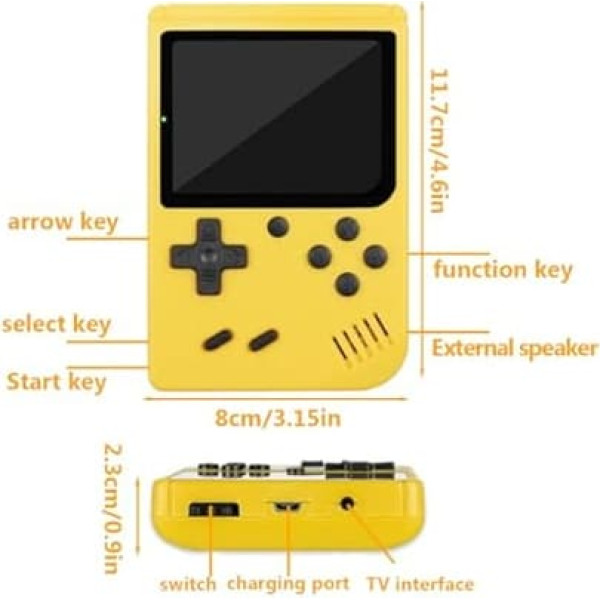 Product description CLASSIC GAMES Enjoy 500 exciting games. Whether racing games or thinking games, with this wide range of games you will never get bored. CLASSIC Challenge yourself, play nostalgic games and enjoy classic melodies. Back to the 90s: classic games in many different categories. On the spots, ready, go! Compact Size The handheld game console is 4.72 x 3.15 x 0.91 inches, compact and portable and easily fits in a backpack or jacket pocket. GIFT IDEA This handheld game console is an ideal gift for kids and adults.; Product description CLASSIC GAMES Enjoy 500 exciting games. Whether racing games or thinking games, with this wide range of games you will never get bored. CLASSIC Challenge yourself, play nostalgic games and enjoy classic melodies. Back to the 90s: classic games in many different categories. On the spots, ready, go! Compact Size The handheld game console is 4.72 x 3.15 x 0.91 inches, compact and portable and easily fits in a backpack or jacket pocket. GIFT IDEA This handheld game console is an ideal gift for kids and adults.; CLASSIC GAMES Enjoy 500 exciting games. Whether racing games or thinking games, with this wide range of games you will never get bored. CLASSIC Challenge yourself, play nostalgic games and enjoy classic melodies. Back to the 90s: classic games in many different categories. On the spots, ready, go! Compact Size The handheld game console is 4.72 x 3.15 x 0.91 inches, compact and portable and easily fits in a backpack or jacket pocket. GIFT IDEA This handheld game console is an ideal gift for kids and adults.