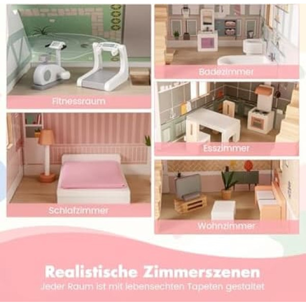 3-tier wooden dollhouse - This wooden dollhouse with removable roofs on both sides offers your children endless creative fun. The opening doors and exquisite windows invite toddlers to explore any room, enhancing their role-playing experience. Lifelike rooms with details: Each room in this dollhouse has realistic wallpaper patterns that create a lifelike atmosphere. The home gym, bedroom, bathroom, dining room and living room provide a complete home experience for your little ones and keep children busy for hours of fun. Rich furniture and accessories: this wooden dollhouse contains a wide range of furniture and accessories, so children can fully furnish and equip their dream rooms in a realistic design. The furniture and accessories can be replaced according to your child's wishes. Great gift option for children: This wooden dollhouse is suitable for children aged 3 and up and a fantastic gift option for any special occasion. The dollhouse not only provides endless fun, but also helps develop imagination, colour recognition, coordination and social skills. Reliable use and easy assembly: This dream house playset has been built with your child's safety in mind and meets high standards, so parents can rest assured The unique design with locking parts ensures tool-free assembly, so it is ready to use without much effort. › See more product details; Product description Product description Description: Delight your little ones with this wooden dollhouse This wooden dollhouse includes a gym, bedroom, bathroom, dining room and living room, all adorned with lifelike wallpaper for a realistic feel. The roofs are removable and reversible, which extends playtime. Complete with a range of furniture and accessories, the dream house offers your child a comprehensive play experience. This dollhouse playset is a great gift for children aged 3 and up and promotes imagination, coordination and social skills. Safety is top priority as this dollhouse meets high standards. By the way, the locking parts ensure easy installation and save time and effort. Features: Double sided roofs are removable for stepless creativity and versatility Toddlers gain access to a dream house when they open the roofs as well as the large and small doors Includes a home gym, bedroom, bathroom, dining room and living room to mimic a real home Each room is designed with lifelike wallpaper to provide realistic room scenes Comes with rich furniture and accessories for endless DIY fun Tool-free assembly with a unique snap-in design to save you time and effort Great gift for children aged 3 and up on any special occasion Technical data: Colour: multi-coloured. Materials: MDF, pine wood, plywood. Product dimensions: 55 x 35 x 66 cm (L x W x H). Distance between 2 levels: 21.5 cm. Net weight: 9.5 kg. Suitable age: from 3 years Box contents: 1 x wooden dollhouse. 19 x accessories for setting up. 1 x instruction manual Safety Warning /; Product description Product description Description: Delight your little ones with this wooden dollhouse This wooden dollhouse includes a gym, bedroom, bathroom, dining room and living room, all adorned with lifelike wallpaper for a realistic feel. The roofs are removable and reversible, which extends playtime. Complete with a range of furniture and accessories, the dream house offers your child a comprehensive play experience. This dollhouse playset is a great gift for children aged 3 and up and promotes imagination, coordination and social skills. Safety is top priority as this dollhouse meets high standards. By the way, the locking parts ensure easy installation and save time and effort. Features: Double sided roofs are removable for stepless creativity and versatility Toddlers gain access to a dream house when they open the roofs as well as the large and small doors Includes a home gym, bedroom, bathroom, dining room and living room to mimic a real home Each room is designed with lifelike wallpaper to provide realistic room scenes Comes with rich furniture and accessories for endless DIY fun Tool-free assembly with a unique snap-in design to save you time and effort Great gift for children aged 3 and up on any special occasion Technical data: Colour: multi-coloured. Materials: MDF, pine wood, plywood. Product dimensions: 55 x 35 x 66 cm (L x W x H). Distance between 2 levels: 21.5 cm. Net weight: 9.5 kg. Suitable age: from 3 years Box contents: 1 x wooden dollhouse. 19 x accessories for setting up. 1 x instruction manual Safety Warning /; Product description Description: Delight your little ones with this wooden dollhouse This wooden dollhouse includes a gym, bedroom, bathroom, dining room and living room, all adorned with lifelike wallpaper for a realistic feel. The roofs are removable and reversible, which extends playtime. Complete with a range of furniture and accessories, the dream house offers your child a comprehensive play experience. This dollhouse playset is a great gift for children aged 3 and up and promotes imagination, coordination and social skills. Safety is top priority as this dollhouse meets high standards. By the way, the locking parts ensure easy installation and save time and effort. Features: Double sided roofs are removable for stepless creativity and versatility Toddlers gain access to a dream house when they open the roofs as well as the large and small doors Includes a home gym, bedroom, bathroom, dining room and living room to mimic a real home Each room is designed with lifelike wallpaper to provide realistic room scenes Comes with rich furniture and accessories for endless DIY fun Tool-free assembly with a unique snap-in design to save you time and effort Great gift for children aged 3 and up on any special occasion Technical data: Colour: multi-coloured. Materials: MDF, pine wood, plywood. Product dimensions: 55 x 35 x 66 cm (L x W x H). Distance between 2 levels: 21.5 cm. Net weight: 9.5 kg. Suitable age: from 3 years Box contents: 1 x wooden dollhouse. 19 x accessories