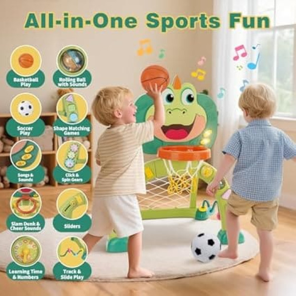 Sport und Lernen in einem Spielzeug: Mehr als nur ein Basketballkorb für Kleinkinder, dieses dinosaurus-themierte 2-in-1-Sportzentrum kombiniert Basketball und Fußball. Es hilft Kindern im Alter von 12–36 Monaten, Hand-Augen-Koordination, Gleichgewicht und motorische Fähigkeiten aufzubauen, während sie drinnen oder draußen Spaß haben. Perfekte Entwicklungsspielzeuge für 1-jährige Jungen und Mädchen als Geburtstagsgeschenke. Frühförderzentrum mit vielfältigen Aktivitäten: Wecken Sie Neugier mit 7+ pädagogischen Aktivitäten: Formen-Sortierer, Abakus, drehende Zahnräder, Schieber, Rassel-Kugeln, Uhr mit Zeit/Zahlen und Ringwerfen. Es stärkt feinmotorische Fähigkeiten, Farb-/Formenkenntnis, Problemlösung und sensorische Entdeckung für Kleinkinder im Alter von 1–2 Jahren. Ideale pädagogische Spielzeuge für ein- und zweijährige Kinder. Lichter, Geräusche und multisensorisches Lernen: Drücken Sie Tasten, um Tiernamen, Geräusche und Musik mit Lichtern zu hören! Treffen Sie Körbe und erhalten Sie belohnende Sätze, Jubel und lustige Geräusche, um jedes Tor zu feiern. Ein ideales musikalisches Spielzeug für Babys im Alter von 12–18 Monaten, das Vokabular, Geräuschekenntnis und Ursache-Wirkung-Verständnis stärkt. Sicher, langlebig und einfach für Eltern: Sorgenfreies Spielvergnügen! Hergestellt aus BPA-freiem Kunststoff mit glatten, abgerundeten Kanten, sorgt dieser Basketballkorb und Fußballtor für Kleinkinder für sicheres Spielen. Das Steckdesign erfordert keine Werkzeuge oder Wasserfüllung – Eltern und Großeltern können es in Minuten aufbauen, drinnen oder im Garten. Es hält starker Spielerei von 1–2-jährigen Kindern stand und sorgt für Ruhe bei Eltern. Ideale musikalische Spielzeuge für Kleinkinder 1–3 Jahre. Geschenkfertiges Aktivitätszentrum: Kombiniert körperliches Spiel (Basketball/Fußball), kognitive Puzzles und musikalischen Spaß in einem Design. Bereit, 1-jährige Jungen/Mädchen mit leuchtenden Farben und interaktiven Funktionen zu begeistern – das perfekte erste Geburtstags- oder Weihnachtsgeschenk für Mädchen, Jungen und Kinder. › See more product details; Product description Product description Fußballtor und Ringwurf, Mini Basketballkorb, Kinder Spielgeräte für Indoor und Outdoor Safety Warning Keine Batterie enthalten; Product description Product description Fußballtor und Ringwurf, Mini Basketballkorb, Kinder Spielgeräte für Indoor und Outdoor Safety Warning Keine Batterie enthalten; Product description Fußballtor und Ringwurf, Mini Basketballkorb, Kinder Spielgeräte für Indoor und Outdoor Safety Warning Keine Batterie enthalten