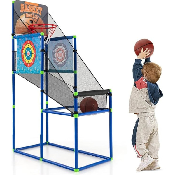 2-in-1 multifunctional design: This 2-in-1 basketball game with fabric target offers you twice the fun: the basketball arcade game and your Velcro ball game. In addition, 2 fabric targets with different patterns provide endless fun for your little ones. Electronic score display and cheerful sound effect. Cheer every hit thanks to the electronic score display. This feature not only helps small players keep track of successful goals, but also adds a cheerful sound effect that makes every game more exciting. Playful learning: This basketball play set is a kind of healthy, fun training device that promotes interaction with the family and intellectual development. It also supports the development of basic skills such as hand-eye coordination and children's responsiveness when they have fun with friends or siblings. Selected material and sturdy frame. This basketball hoop game for children is made of high-quality PVC material and a sturdy frame and is durable for both indoor and outdoor play. In addition, the reinforced board and reinforced basket rim as well as the high-density blocking net ensure a long service life. COMPLETE PLAY SET This basketball playset contains everything you need: 2 sturdy basketballs, a ball pump, 8 Velcro balls and 2 fabric targets. So you now have everything you need for a great time with your children › See more product details; Product description Product description Product Description Are you looking for a practical and interesting basketball game for kids? Then our arcade basketball game is just the thing for you. Our basketball playset combines the basketball arcade game and a Velcro ball game in one, which makes children more fun. The electronic scoring system on the board provides even more excitement, which allows players to keep track of successful goals while listening to cheerful sound effects. The reinforced board and basket together with the high-density blocking net guarantee a long service life, so your children will enjoy this game for years. Features: Electronic scoring with sound effect makes the game even more exciting. Made of high quality PVC material and durable frame for great stability The reinforced back panel and rim ensure a long service life Certain certifications guarantee reliable quality and safety Two types of targets add more fun Suitable for both indoor and outdoor use Provides double the fun with a basketball arcade game and a Velcro ball game Technical details: Colour: blue. Material: PVC, MDF, Oxford cloth, PP Overall dimensions: 80.5 x 41.5 x 135 cm (L x W x H). Gift box measures 34 x 11 x 41 cm (L x W x H) Inner diameter of the rim: 23 cm. Basketball diameter: 16 cm. Suitable age: from 3 years Net weight: 2 kg. Package includes: 1 x arcade basketball game. 1 x ball pump. 2 x basketballs. 8 x Velcro balls. 1 x instruction manual Safety Warning /; Product description Product description Product Description Are you looking for a practical and interesting basketball game for kids? Then our arcade basketball game is just the thing for you. Our basketball playset combines the basketball arcade game and a Velcro ball game in one, which makes children more fun. The electronic scoring system on the board provides even more excitement, which allows players to keep track of successful goals while listening to cheerful sound effects. The reinforced board and basket together with the high-density blocking net guarantee a long service life, so your children will enjoy this game for years. Features: Electronic scoring with sound effect makes the game even more exciting. Made of high quality PVC material and durable frame for great stability The reinforced back panel and rim ensure a long service life Certain certifications guarantee reliable quality and safety Two types of targets add more fun Suitable for both indoor and outdoor use Provides double the fun with a basketball arcade game and a Velcro ball game Technical details: Colour: blue. Material: PVC, MDF, Oxford cloth, PP Overall dimensions: 80.5 x 41.5 x 135 cm (L x W x H). Gift box measures 34 x 11 x 41 cm (L x W x H) Inner diameter of the rim: 23 cm. Basketball diameter: 16 cm. Suitable age: from 3 years Net weight: 2 kg. Package includes: 1 x arcade basketball game. 1 x ball pump. 2 x basketballs. 8 x Velcro balls. 1 x instruction manual Safety Warning /; Product description Product Description Are you looking for a practical and interesting basketball game for kids? Then our arcade basketball game is just the thing for you. Our basketball playset combines the basketball arcade game and a Velcro ball game in one, which makes children more fun. The electronic scoring system on the board provides even more excitement, which allows players to keep track of successful goals while listening to cheerful sound effects. The reinforced board and basket together with the high-density blocking net guarantee a long service life, so your children will enjoy this game for years. Features: Electronic scoring with sound effect makes the game even more exciting. Made of high quality PVC material and durable frame for great stability The reinforced back panel and rim ensure a long service life Certain certifications guarantee reliable quality and safety Two types of targets add more fun Suitable for both indoor and outdoor use Provides double the fun with a basketball arcade game and a Velcro ball game Technical details: Colour: blue. Material: PVC, MDF, Oxford cloth, PP Overall dimensions: 80.5 x 41.5 x 135 cm (L x W x H). Gift box measures 34 x 11 x 41 cm (L x W x H) Inner diameter of the rim: 23 cm. Basketball diameter: 16 cm. Suitable age: from 3 years Net weight: 2 kg. Package includes: 1 x arcade basketball game. 1 x ball pump. 2 x basketballs. 8 x Velcro balls. 1 x instruction manual Safety Warning /