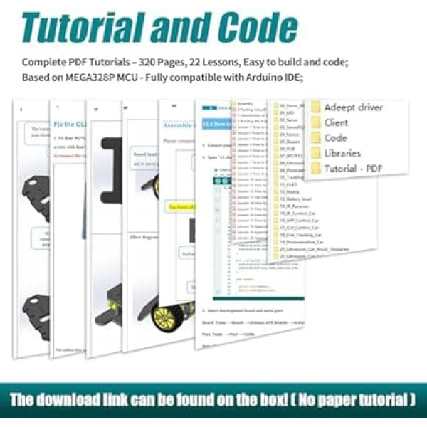 4WD (4WD drive): Each wheel can be driven independently. This smart car kit is designed for students to learn programming, building and robotics. It has been developed on the basis of MEGA328P and is fully compatible with Arduino IDE. It is the best choice for learning programming and robotics. EASY TO ASSEMBLE AND SET UP Detailed tutorials (220 pages, 20 lessons) and full code are included. The download link is on the map in the box (paper tutorials are not available as the tutorials are updated frequently). Multiple control methods: wireless remote control via IR remote control; remote control via app. Multiple functions: IR/wireless remote control, obstacle avoidance, line tracking, light tracking, OLED display, LED matrix, WS2812 RGB LEDs. No additional charger: Built-in USB-C charging. Directly charge 18650 batteries via USB-C cable (included). Intelligent circuit protects against overcharging / overheating › See more product details; Product description Important tips: This set consists of loose parts, you need to assemble it yourself. This 4WD Smart Car Kit is an educational and fun kit based on Arduino, designed for both beginners and professionals to learn electronics, programming and robotics. With our easy-to-follow tutorial, assembling this robot car kit would be very intuitive and easy, regardless of whether you are an engineer or a beginner. Building your own robot project has never been so easy and fun. Just follow our tutorial and step by step you will have your own smart car in no time. Tutorial and code: Detailed tutorials and full code are provided. The download link is on the map in the box (paper tutorials are not available as the tutorials are updated frequently). Package includes: 1 set of structural parts (acrylic). 1 x Adeept Robot Control Board (based on MEGA328P, fully compatible with Arduino IDE) 1 x OLED display 1 x 8 x 16 LED matrix 1 x ESP8266 Module 1 x Ultrasonic Range Sensor 1 x WS2812 RGB LED Module 1 x Line Tracking Module 1 x Light Tracking Module 1 x Remote Control 1 x AD002 Servo Motor 4 x TT Motor 4 x Wheels 1 x Battery Holder 1 x USB-C Cable Other necessary accessories (cables, nuts, screws, copper standoffs, tools, etc.); Product description Important tips: This set consists of loose parts, you need to assemble it yourself. This 4WD Smart Car Kit is an educational and fun kit based on Arduino, designed for both beginners and professionals to learn electronics, programming and robotics. With our easy-to-follow tutorial, assembling this robot car kit would be very intuitive and easy, regardless of whether you are an engineer or a beginner. Building your own robot project has never been so easy and fun. Just follow our tutorial and step by step you will have your own smart car in no time. Tutorial and code: Detailed tutorials and full code are provided. The download link is on the map in the box (paper tutorials are not available as the tutorials are updated frequently). Package includes: 1 set of structural parts (acrylic). 1 x Adeept Robot Control Board (based on MEGA328P, fully compatible with Arduino IDE) 1 x OLED display 1 x 8 x 16 LED matrix 1 x ESP8266 Module 1 x Ultrasonic Range Sensor 1 x WS2812 RGB LED Module 1 x Line Tracking Module 1 x Light Tracking Module 1 x Remote Control 1 x AD002 Servo Motor 4 x TT Motor 4 x Wheels 1 x Battery Holder 1 x USB-C Cable Other necessary accessories (cables, nuts, screws, copper standoffs, tools, etc.); Important tips: This set consists of loose parts, you need to assemble it yourself. This 4WD Smart Car Kit is an educational and fun kit based on Arduino, designed for both beginners and professionals to learn electronics, programming and robotics. With our easy-to-follow tutorial, assembling this robot car kit would be very intuitive and easy, regardless of whether you are an engineer or a beginner. Building your own robot project has never been so easy and fun. Just follow our tutorial and step by step you will have your own smart car in no time. Tutorial and code: Detailed tutorials and full code are provided. The download link is on the map in the box (paper tutorials are not available as the tutorials are updated frequently). Package includes: 1 set of structural parts (acrylic). 1 x Adeept Robot Control Board (based on MEGA328P, fully compatible with Arduino IDE) 1 x OLED display 1 x 8 x 16 LED matrix 1 x ESP8266 Module 1 x Ultrasonic Range Sensor 1 x WS2812 RGB LED Module 1 x Line Tracking Module 1 x Light Tracking Module 1 x Remote Control 1 x AD002 Servo Motor 4 x TT Motor 4 x Wheels 1 x Battery Holder 1 x USB-C Cable Other necessary accessories (cables, nuts, screws, copper standoffs, tools, etc.)