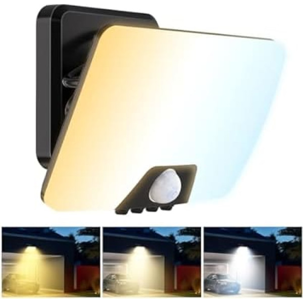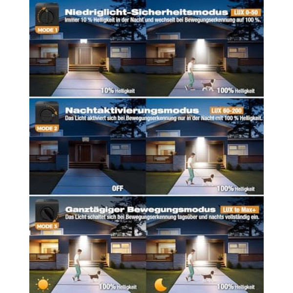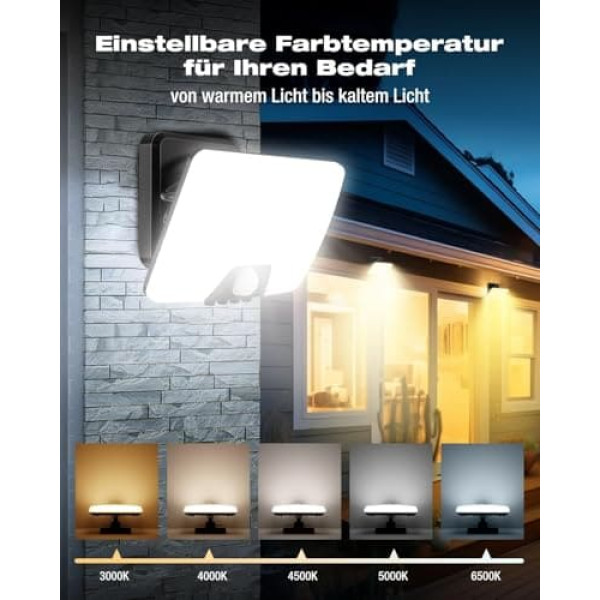 Safety mode (LUX = 50): constant low brightness: the light turns on automatically at dusk and remains at 10% brightness. It activates to full brightness when motion is detected. This mode provides low lighting to improve safety and deter intruders while saving energy. Ideal for navigating outside areas such as driveways or sidewalks without being too bright 【Night Sensor Mode(LUX=200): Improved Night Safety】This mode provides bright, energy-efficient lighting when needed. The light turns on with full brightness at night when motion is detected and turns off automatically when no motion is detected. Ideal for entrances, windows, garages and paths, it improves safety on night arrivals Detection mode (LUX to Max+): 24/7 security monitoring: this mode activates the light at 100% brightness when detecting motion, daytime and night. Ideal for monitored areas and entrances, it provides sufficient lighting at all times to improve safety. Perfect for hallways and staircases, it helps prevent accidents by providing continuous lighting 5 colour temperature options: this outdoor light with motion sensor offers 5 colour temperatures from warm 2700 K to cold 6500 K. Choose a cosy 3000K warm white for the garden, 4000K-5000K neutral white for the evening and 6500K cool white for bright safety headlights. Adjust your lighting for the desired atmosphere and safety 【Time/LUX/Sensor/CCT Adjustable】Adjust your experience with 4 buttons: CCT: set the colour temperature (3000K-6500K). Time: set the duration of continuous light (6 seconds to 5 minutes). LUX: control the light sensitivity (minimum for daytime). Sensor: adjust the detection range (1 to 8 metres) Durable and weatherproof: thanks to the improved LEDs and high-density ABS material, this light offers excellent waterproofness, heat resistance and rust resistance. It works reliably in extreme weather conditions and has a lifespan of 50,000 hours, which corresponds to about 20 years of reliable use Easy and quick installation: only 4 steps and 5 minutes. Follow the picture instructions for quick and easy setup. Experience 180° shadow-free lighting with wide light distribution. Mount the PIR safety flood light in various places, including garden, garage, porch and backyard What you get: Your satisfaction with every purchase is our highest priority. We support this through our commitment to customer service. If you have any problems with your outdoor floodlights, our first-class customer service team is here to help you › See more product details
