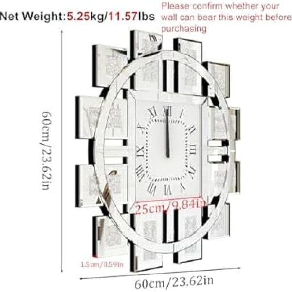 LUXURY CRYSTAL WALL CLOCK: With silver crystal accents and glass frame, this wall clocks combines luxurious elegance and timeless charm. Roman numerals accentuate the classic style, while their unique design enhances any room and attracts everyone's attention Practical & aesthetic clock: hardly any home accessory combines beauty and function like this clock. It fills wall gaps, is compact and precise. The quiet quartz movement ensures silent sleep - ideal for the bedroom High-quality wall clock: Made of oxidation-resistant glass and dimensionally stable MDF back, the clock remains durable and streamlined. With screws and D-ring for vertical wall mounting Perfect decorative clocks: this charming wall clock looks particularly attractive over dressing table, sideboard, door, fireplace or display case. Hang them at appropriate height - ideal at eye level or slightly above - so you always keep an eye on the time Note: Batteries are not included. Requires 1 x AA battery (not included). If you have any questions before or after purchase, please feel free to contact us at any time - we will be happy to help you › See more product details