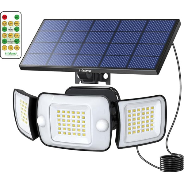 Giant wide angle lighting: intelmap super bright solar lamp with motion sensor, 108 LED lamp beads with high brightness (brightness up to 1200 lumens). When folded out, the scattering angle goes up to 270 degrees. Lighting design illuminates this intelamp solar lamp with a range of approx. 70 square metres that you can easily orient yourself and also see details very well. 2 PIR sensor-4 lighting modes: intelamp solar spotlight with motion sensor with dual sensor design detects movement over a much larger area than single sensor models and offers 180 degree range detection, cover a whole house wall on the width thanks to its 180 degree arrangement, even if you come sideways, is triggered. The detection is sufficient loosely 10-16. meter.intelamp solar lights have 4 lighting modes to choose from, meet your different requirements. Remote control: Intelamp solar lights are equipped with a large and simple remote control that allows powerful function settings to be easily made. Unlike other solar sensor lights that are only bright for 30 seconds, intelamp LED solar spotlight can set the detection time for highlighting to 20 seconds, 30 seconds and 40 seconds, so that the bright solar lights do not change in low light. High efficiency, energy saving and environmental protection: the very large solar collector collects very well light and thus juice for the battery. Intelamp solar lights for outdoor use weatherproof uses a safe lithium iron phosphate battery with 6000 mAh and super large capacity, which is enough for more than the whole night according to the duration of sunlight. A silicone solar panel with a high conversion rate of 22%, which has more than 2000 charging cycles and a service life. Easy installation with 2.7 m cable: the intelamp solar LED spotlight with outdoor motion sensor comes with screws and cable ties. You can attach it to the wall or in the form of a sturdy cable tie to a lantern post or similar. The solar panel comes with a 3 m long cable and the solar panel can be installed in a place with sufficient sunlight for a better charging effect (the ideal installation height is about 1.7 to 2 meters). Worry-free after-sales service: intelamp solar lights offer a complete set of installation accessories and worry-free after-sales service. Please test the function first after receiving the product before installing and using it. If any problems occur during use, you can contact our after-sales support at any time. › See more product details