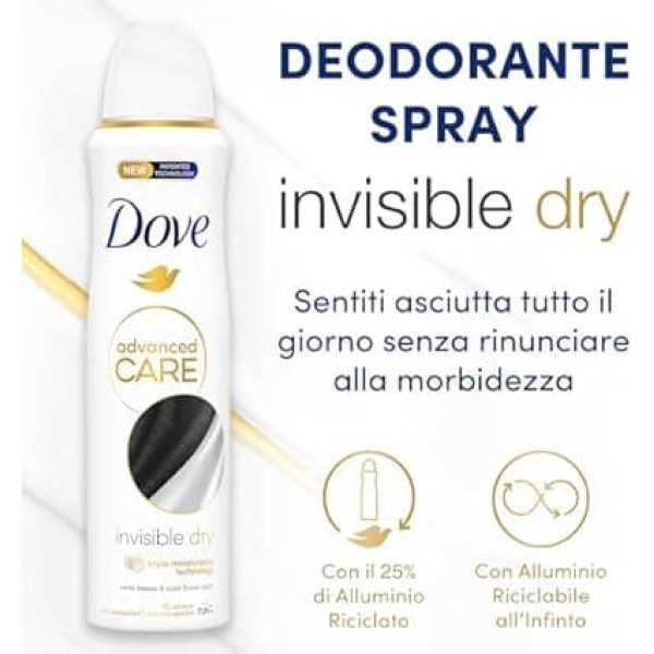 DOVE DEODORANT SPRAY Starting today, you can feel confident to use the deodorant without the hassle of stains on skin and clothes with the Dove Advanced Care Invisible Dry Spray 72 hours protection: after each use, the Dove deodorant spray protects you from sweat and odours for 72 hours, also helps reduce irritation caused by the gentle formula caused by shaving TRIPLE MOISTURISING TECHNOLOGY: Mild and alcohol-free formula, the Triple Moisturising Technology uses three different types of moisturizers that help the skin retain moisture INVISIBLE DRY AIR FRESHENER It's time to wear your favorite looks without fear thanks to this anti-stain deodorant DEODORANTI DOVE: Dove nourishes the sensitive skin of your armpits and offers deodorants with dermatologically tested formulas › See more product details; Product description Product Description Do you want to wear your most radiant colours without fear of stains? We have the right product for you. Starting today, you can feel confident that you are using the deodorant without problems of stains on skin and clothing with the Dove Advanced Care Invisible Dry Spray. Enriched with our most advanced formula, it contains moisturising ingredients and triple moisturising technology that helps the skin barrier retain moisture for smooth and soft skin you'll look forward to. All this without sacrificing sweat and odour protection for up to 72 hours after application. No stains? Zero stress. With this anti-stain solution, you can wear your favourite looks without fear. Black dresses, bright looks, bright colours, definitely this air freshener will be by your side. Directions Apply under the armpits Safety Warning Precautions: Shake well before use, apply to the armpits from a distance of at least 15 cm. Allow to dry. Warning: Do not apply to injured skin. Discontinue use if irritated. Avoid inhaling directly. Only short spray, use in ventilated places, do not use excess product. Do not spray near the eyes. Use only as directed. DANGER: Extremely flammable aerosol. Pressurised container: may burst when heated. Keep away from heat, hot surfaces, sparks, open flames and other sources of ignition. No smoking. Do not spray against open flame or other source of ignition. Do not pierce or burn, even after use. Keep out of sunlight. Do not expose to temperatures above 50°C. Keep out of reach of children. See more; Product description Product Description Do you want to wear your most radiant colours without fear of stains? We have the right product for you. Starting today, you can feel confident that you are using the deodorant without problems of stains on skin and clothing with the Dove Advanced Care Invisible Dry Spray. Enriched with our most advanced formula, it contains moisturising ingredients and triple moisturising technology that helps the skin barrier retain moisture for smooth and soft skin you'll look forward to. All this without sacrificing sweat and odour protection for up to 72 hours after application. No stains? Zero stress. With this anti-stain solution, you can wear your favourite looks without fear. Black dresses, bright looks, bright colours, definitely this air freshener will be by your side. Directions Apply under the armpits Safety Warning Precautions: Shake well before use, apply to the armpits from a distance of at least 15 cm. Allow to dry. Warning: Do not apply to injured skin. Discontinue use if irritated. Avoid inhaling directly. Only short spray, use in ventilated places, do not use excess product. Do not spray near the eyes. Use only as directed. DANGER: Extremely flammable aerosol. Pressurised container: may burst when heated. Keep away from heat, hot surfaces, sparks, open flames and other sources of ignition. No smoking. Do not spray against open flame or other source of ignition. Do not pierce or burn, even after use. Keep out of sunlight. Do not expose to temperatures above 50°C. Keep out of reach of children. See more; Product Description Do you want to wear your most radiant colours without fear of stains? We have the right product for you. Starting today, you can feel confident that you are using the deodorant without problems of stains on skin and clothing with the Dove Advanced Care Invisible Dry Spray. Enriched with our most advanced formula, it contains moisturising ingredients and triple moisturising technology that helps the skin barrier retain moisture for smooth and soft skin you'll look forward to. All this without sacrificing sweat and odour protection for up to 72 hours after application. No stains? Zero stress. With this anti-stain solution, you can wear your favourite looks without fear. Black dresses, bright looks, bright colours, definitely this air freshener will be by your side. Directions Apply under the armpits Safety Warning Precautions: Shake well before use, apply to the armpits from a distance of at least 15 cm. Allow to dry. Warning: Do not apply to injured skin. Discontinue use if irritated. Avoid inhaling directly. Only short spray, use in ventilated places, do not use excess product. Do not spray near the eyes. Use only as directed. DANGER: Extremely flammable aerosol. Pressurised container: may burst when heated. Keep away from heat, hot surfaces, sparks, open flames and other sources of ignition. No smoking. Do not spray against open flame or other source of ignition. Do not pierce or burn, even after use. Keep out of sunlight. Do not expose to temperatures above 50°C. Keep out of reach of children. See more