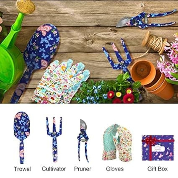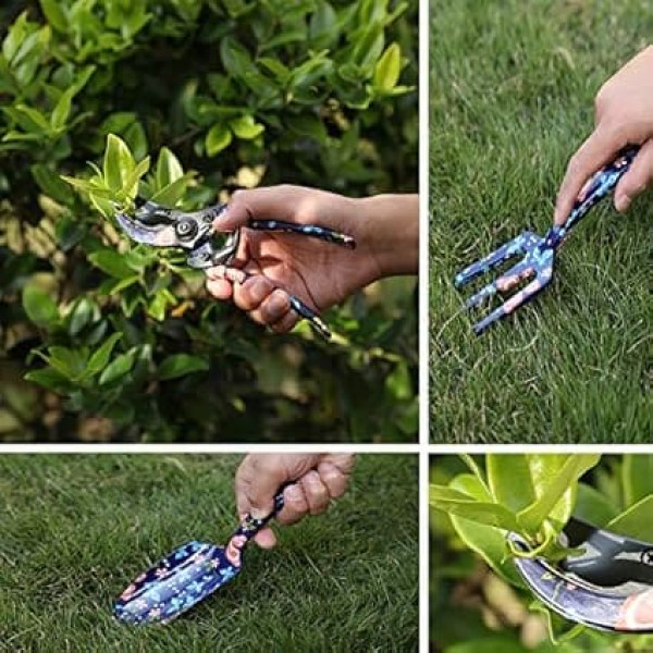 ELEGANT 4 PIECE SET: This garden tool set includes a pruner, a hand shovel, a hand rake and gloves; The set is lightweight and compact with built-in hanging holes for optimized storage, ideal for meeting your most important gardening needs. High quality materials: this garden tool is made of high quality aluminum alloy with noble surface, rust-proof and deformation resistant; Aluminum is lighter than steel, providing increased comfort of use with the same durability. COLORFUL FLORAL PATTERNS: All four garden accessories pieces are ergonomic and comfortable in the hand; The decorated floral patterns will enhance your garden and make gardening more enjoyable. Versatile Applicability Secateurs, hand shovel and hand rake with protective gloves precisely handle various garden shovel small tasks, whether with balcony plants or garden maintenance. IDEAL GARDEN GIFT: This garden gadget with fine floral patterns and high quality aluminum look is a perfect gift for friends, family and garden knife enthusiasts. › See more product details