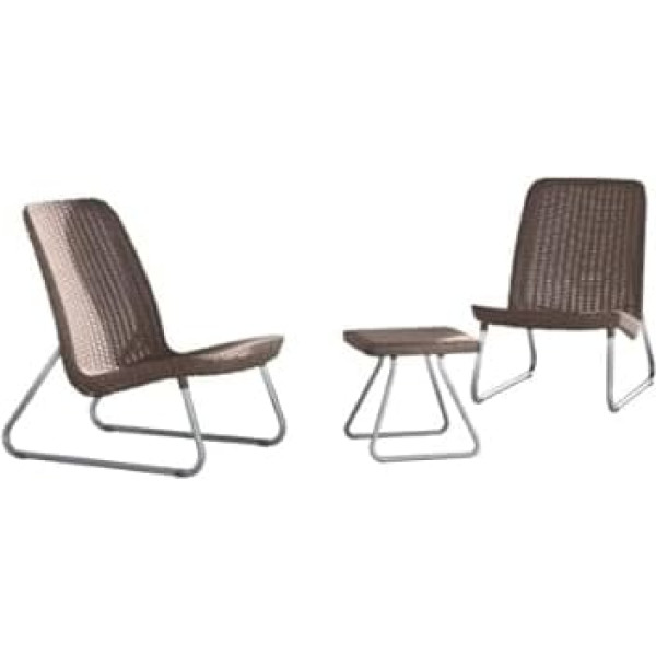 Lounge set consisting of two chairs and a table Dimensions (L x W x H): Chair: approx. 77.5 x 76 x 54 cm; table: approx. 38 x 38 x 36.5 cm Made from UV and weather-resistant, high-quality polypropylene (plastic) › See more product details; Product description Product Description Rio Patio Set The Young Lounge Set andnbsp; About Keter With its novel and innovative items, the Keter Group has been one of the leading manufacturers of plastic products for over 60 years. The core range of Keter includes garden furniture, children's items and storage systems for the household, garden and DIY sector. The set This innovative lounge set sets accents with its modern design. The curved armchairs offer a high level of seating comfort and invite you to linger. On the small table fits everything you need for a warm summer evening. The set consists of 2 lounge chairs and a small square table. Chill in this innovative set and enjoy the summer. The material: The Rio patio set is made of high-quality UV and weather-resistant plastic (100% polypropylene) by injection moulding. It cannot chip, fray or rust. The unique manufacturing system gives the set a lifelike rattan look. Sun, rain and even snow do not affect the plastic, so the bistro set can be outdoors all year round. Why choose a plastic item? We give you 5 reasons: Colorfast - The colors of plastic are colorfast; even with years of outdoor use, the plastic will retain its beautiful colors. Durable - The plastic items are intended for long-term and intensive use. With little care, you will enjoy it for years. Weatherproof - The plastic items have no problem with blazing sun and rain. Clean in no time at all – almost maintenance-free: it is enough to clean the items now and then with a mild all-purpose cleaner and a brush or simply rinse with the garden hose in between. Recycled - The plastic items are fully recyclable. Your item will quickly get a new function. So the environmental impact is limited andnbsp; Details Consists of 2 lounge chairs and 1 square side table. Dimensions (W x D x H): approx. 77.5 x 76 x 54 cm. Table: approx. 38 x 38 x 36.5 cm. Colour: brown. Quick and easy assembly thanks to the click plug-in system. Suitable for indoor and outdoor use. Safety Warning Careful about sharp edges. Ensure stable placement when using outdoors to avoid tipping risks. Always follow the installation instructions for safe setup.; Product description Product Description Rio Patio Set The Young Lounge Set andnbsp; About Keter With its novel and innovative items, the Keter Group has been one of the leading manufacturers of plastic products for over 60 years. The core range of Keter includes garden furniture, children's items and storage systems for the household, garden and DIY sector. The set This innovative lounge set sets accents with its modern design. The curved armchairs offer a high level of seating comfort and invite you to linger. On the small table fits everything you need for a warm summer evening. The set consists of 2 lounge chairs and a small square table. Chill in this innovative set and enjoy the summer. The material: The Rio patio set is made of high-quality UV and weather-resistant plastic (100% polypropylene) by injection moulding. It cannot chip, fray or rust. The unique manufacturing system gives the set a lifelike rattan look. Sun, rain and even snow do not affect the plastic, so the bistro set can be outdoors all year round. Why choose a plastic item? We give you 5 reasons: Colorfast - The colors of plastic are colorfast; even with years of outdoor use, the plastic will retain its beautiful colors. Durable - The plastic items are intended for long-term and intensive use. With little care, you will enjoy it for years. Weatherproof - The plastic items have no problem with blazing sun and rain. Clean in no time at all – almost maintenance-free: it is enough to clean the items now and then with a mild all-purpose cleaner and a brush or simply rinse with the garden hose in between. Recycled - The plastic items are fully recyclable. Your item will quickly get a new function. So the environmental impact is limited andnbsp; Details Consists of 2 lounge chairs and 1 square side table. Dimensions (W x D x H): approx. 77.5 x 76 x 54 cm. Table: approx. 38 x 38 x 36.5 cm. Colour: brown. Quick and easy assembly thanks to the click plug-in system. Suitable for indoor and outdoor use. Safety Warning Careful about sharp edges. Ensure stable placement when using outdoors to avoid tipping risks. Always follow the installation instructions for safe setup.; Product Description Rio Patio Set The Young Lounge Set andnbsp; About Keter With its novel and innovative items, the Keter Group has been one of the leading manufacturers of plastic products for over 60 years. The core range of Keter includes garden furniture, children's items and storage systems for the household, garden and DIY sector. The set This innovative lounge set sets accents with its modern design. The curved armchairs offer a high level of seating comfort and invite you to linger. On the small table fits everything you need for a warm summer evening. The set consists of 2 lounge chairs and a small square table. Chill in this innovative set and enjoy the summer. The material: The Rio patio set is made of high-quality UV and weather-resistant plastic (100% polypropylene) by injection moulding. It cannot chip, fray or rust. The unique manufacturing system gives the set a lifelike rattan look. Sun, rain and even snow do not affect the plastic, so the bistro set can be outdoors all year round. Why choose a plastic item? We give you 5 reasons: Colorfast - The colors of plastic are colorfast; even with years of outdoor use, the plastic will retain its beautiful colors. Durable - The plastic items are intended for long-term and intensive use. With little care, you will enjoy it for years. Weatherproof - The plastic items have no problem with blazing sun and rain. Clean in no time at all –