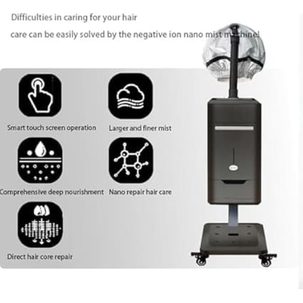 Portable and easy to use: the user-friendly design ensures a quick start and intuitive operation and is suitable for both professionals and DIY enthusiasts. From pore-opening hot mist for hair treatments to pore-reducing cold mist Quiet, efficient and intelligent: Experience quiet, efficient performance with the fully improved hair steamer. Its large, fine mist output provides both hot and cold options for targeted care, prevents hair damage and improves shine Versatile professional hair care: this steamer is appreciated by hairdressers and is a must for salons, barber shops and home use. It improves hair colour for vibrant, even results and is ideal for perming at low temperatures. Advanced micro-mist detoxification technology: Revitalise your scalp with microscopic water particles created by the state-of-the-art micro-mist technology of the hair steamer. It releases nano-ion micro water mist that thoroughly cleanses and clarifies the scalp while repairing damaged hair cells Improved comfort and relaxation: this steamer is designed for seamless combination with deck chairs and ensures a relaxing and comfortable treatment experience. The gentle steam heat accelerates blood circulation at the hair roots and helps hair products penetrate deeper and achieve maximum absorption. › See more product details; Product description Are you still having problems with poor styling and hair loss? Our hair steamer offers numerous functions for your daily styling needs. Thanks to its generous look, it fits easily into different environments. This beautiful and practical hair steamer is the ideal choice. Weight: 2.5 kg. Product size: 120 cm × 32 cm × 35 cm. Package weight: 13 kg Control panel: touch control panel Machine power: 500 W. Water supply bottle capacity: 1400 ml. Drainage tank capacity: 450ml Box contents: 1 x nano hair steamer. 1 x power cable. 1 x English lessons. 4 x universal wheels. 1 x removable strap. All accessories for use Note: 1. Please check the color and size before purchase 2. The above data is for reference only, the size is measured manually, the error is 1-2 mm, please understand, thank you 3. If you find a problem with our products, please contact us by email. We will solve the problem as soon as possible.; Product description Are you still having problems with poor styling and hair loss? Our hair steamer offers numerous functions for your daily styling needs. Thanks to its generous look, it fits easily into different environments. This beautiful and practical hair steamer is the ideal choice. Weight: 2.5 kg. Product size: 120 cm × 32 cm × 35 cm. Package weight: 13 kg Control panel: touch control panel Machine power: 500 W. Water supply bottle capacity: 1400 ml. Drainage tank capacity: 450ml Box contents: 1 x nano hair steamer. 1 x power cable. 1 x English lessons. 4 x universal wheels. 1 x removable strap. All accessories for use Note: 1. Please check the color and size before purchase 2. The above data is for reference only, the size is measured manually, the error is 1-2 mm, please understand, thank you 3. If you find a problem with our products, please contact us by email. We will solve the problem as soon as possible.; Are you still having problems with poor styling and hair loss? Our hair steamer offers numerous functions for your daily styling needs. Thanks to its generous look, it fits easily into different environments. This beautiful and practical hair steamer is the ideal choice. Weight: 2.5 kg. Product size: 120 cm × 32 cm × 35 cm. Package weight: 13 kg Control panel: touch control panel Machine power: 500 W. Water supply bottle capacity: 1400 ml. Drainage tank capacity: 450ml Box contents: 1 x nano hair steamer. 1 x power cable. 1 x English lessons. 4 x universal wheels. 1 x removable strap. All accessories for use Note: 1. Please check the color and size before purchase 2. The above data is for reference only, the size is measured manually, the error is 1-2 mm, please understand, thank you 3. If you find a problem with our products, please contact us by email. We will solve the problem as soon as possible.