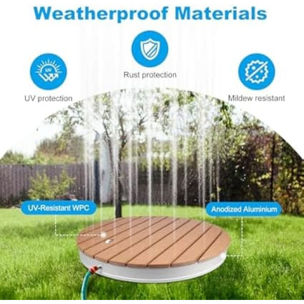 Height adjustment & foot wheel control: Enjoy a refreshing cooling with the adjustable fountain height (up to 4 m at 5 bar pressure) and the practical foot wheel control - perfect for children and adults to easily adjust the water temperature and jet strength. WEATHERPROOF MATERIALS & SAFETY: The UV-resistant WPC base plate with non-slip surface and robust aluminium housing protect against moisture, mould and corrosion - ideal for continuous use in the garden, by the pool or camping. Easy installation and multi-purpose use: thanks to standard garden hose connection (including adapter) and tool-free installation in 30 seconds, the floor shower is ready to use immediately - whether as a pool shower, sauna shower or mobile camping shower. Water-saving and environmentally friendly: with finely atomised water particles and adaptive pressure regulation (from 0.2 MPa), the shower saves up to 20% water - perfect for sustainable garden irrigation or efficient floor cleaning. Safety and ease of use for children: the non-slip surface of the outdoor shower ensures maximum safety, especially for children who can enjoy themselves safely on hot days. › See more product details