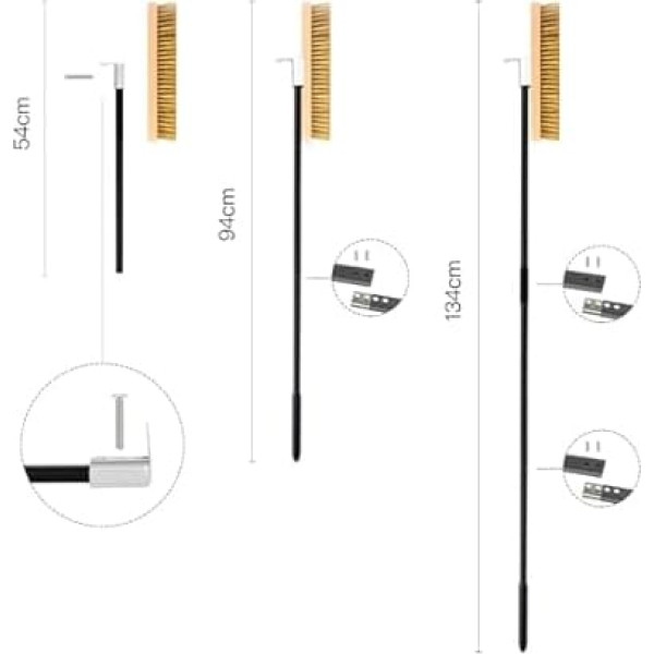 Large practical brush head: the brush head is 24 cm long, made of beech wood and brass bristles. It can be installed horizontally or vertically to meet your cleaning needs. Convenient for cleaning the corners of pizza ovens, pizza stones and grill grates TWO SIZES OF HANDLES Comes with handles of 37\