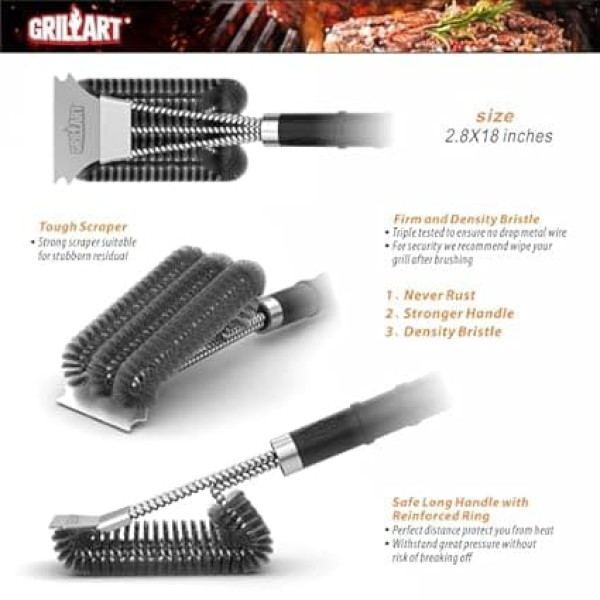 EFFICIENT AND COMFORTABLE CONSTRUCTION - Grill cleaning brush with durable scraper. 360 degree firm bristle brush cleans quickly and comprehensively. Effortless cleaning with perfectly angled and ergonomic handle. ROUND HEAD BBQ GRILL BRUSH FOR 360 DEGREE CLEANING - The round head BBQ wire brush has bristles in all directions. Thick and stiff bristles surrounding the grill metal rods can perfectly clean the grill top, sides and bottom back and forth in just a few strokes. Heavy Duty Scraper Specially Designed for Stubborn Residue - Especially grooves on each side of the grill scraper can easily repel the raw material from the round grates without scratching your expensive grill. DELUXE HANDLE - Comfortable handle with reinforcement ring can withstand great pressure, ergonomic and non-slip handle can make full use of your muscle strength on the grate. Better control and efficient cleaning. Larger hanging ring is very convenient to hang the grill brush anywhere. Sturdy and Durable - Stainless steel grill brush and handle with reinforcing ring design can be more stable, so they will not break easily. It can last for years without deformation or splitting after frequent use. Gentle reminder - All grill brushes wear out at some point. For safety and health reasons, use a damp cloth to wipe grill grates after cleaning to prevent bristles from being left behind. › See more product details; Product description Safe and efficient cleaning. Improved grill brush for efficient and safe cleaning. You will look smart with the efficient grill brush from GRILLART If others struggle with hard grease, you can easily clean hard trash with a stoke. Our grill brush for grill with a wide grill scraper, 18 inch long handle with a nice angle and dense bristles designed to clean quickly, deeply and efficiently. Ideal best gift for barbecue masters and barbecue enthusiasts. Warm tip: all brushes wear out at some point. As they get older, it is important to check that no bristles come off. When this starts, it's time for a replacement. Recommendations for grill after use, for safety and health, whether you use grill brush accessories, please use a damp cloth to wipe the grill to ensure that the grill is without dust, block, bristles. NOTE: Brown markings on the scraper were sweat marks that will not rust. It was caused by the process of welding grill brushes and grill scraper at high temperature (1.496.7 °C). Therefore, it is normal to leave brown welding marks on the top of the scraper. You can rest assured that it is not a quality problem.; Product description Safe and efficient cleaning. Improved grill brush for efficient and safe cleaning. You will look smart with the efficient grill brush from GRILLART If others struggle with hard grease, you can easily clean hard trash with a stoke. Our grill brush for grill with a wide grill scraper, 18 inch long handle with a nice angle and dense bristles designed to clean quickly, deeply and efficiently. Ideal best gift for barbecue masters and barbecue enthusiasts. Warm tip: all brushes wear out at some point. As they get older, it is important to check that no bristles come off. When this starts, it's time for a replacement. Recommendations for grill after use, for safety and health, whether you use grill brush accessories, please use a damp cloth to wipe the grill to ensure that the grill is without dust, block, bristles. NOTE: Brown markings on the scraper were sweat marks that will not rust. It was caused by the process of welding grill brushes and grill scraper at high temperature (1.496.7 °C). Therefore, it is normal to leave brown welding marks on the top of the scraper. You can rest assured that it is not a quality problem.; Safe and efficient cleaning. Improved grill brush for efficient and safe cleaning. You will look smart with the efficient grill brush from GRILLART If others struggle with hard grease, you can easily clean hard trash with a stoke. Our grill brush for grill with a wide grill scraper, 18 inch long handle with a nice angle and dense bristles designed to clean quickly, deeply and efficiently. Ideal best gift for barbecue masters and barbecue enthusiasts. Warm tip: all brushes wear out at some point. As they get older, it is important to check that no bristles come off. When this starts, it's time for a replacement. Recommendations for grill after use, for safety and health, whether you use grill brush accessories, please use a damp cloth to wipe the grill to ensure that the grill is without dust, block, bristles. NOTE: Brown markings on the scraper were sweat marks that will not rust. It was caused by the process of welding grill brushes and grill scraper at high temperature (1.496.7 °C). Therefore, it is normal to leave brown welding marks on the top of the scraper. You can rest assured that it is not a quality problem.