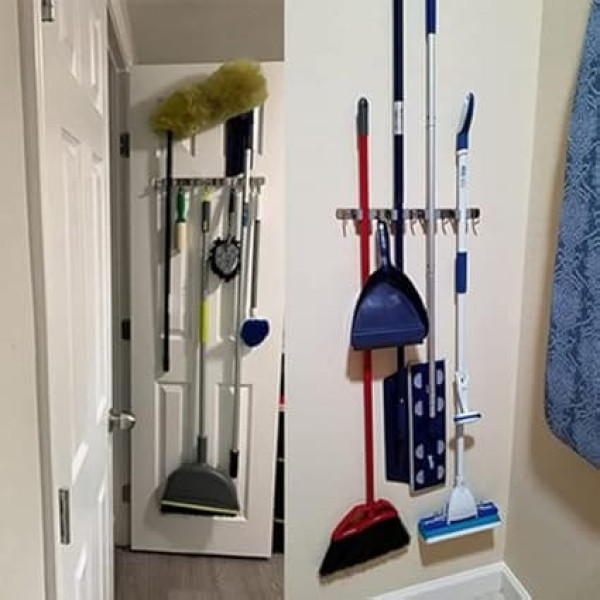 Robust and space-saving: the SUS304 stainless steel broom holder is more durable than plastic; the multifunctional broom holder with 4 holders and 5 hooks can save space thanks to its compact size and strong organiser capabilities Perfect tool organiser – keep your cleaning tool tidy and organised. It is a perfect organizer for closet, bathroom, garage, garden, shed or workshop Indoor and outdoor use – as the broom holder is made of SUS304 stainless steel, it works well outdoors thanks to its weatherproof design Easy to Install - There are 2 ways to install this broom holder, we recommend installing screws for heavy hanging or outdoors. If you choose a self-adhesive installation for smooth surfaces, note that the maximum hanging weight is 30 lb 4 slots and 5 hooks › See more product details; Product description Multi-purpose wall organiser, 4 brackets, 5 hooks. Robust and space-saving. The SUS304 stainless steel broom holder is more durable than plastic brackets; The multifunctional broom holder with 4 brackets and 5 hooks can save space thanks to its compact size and sturdy organization skills. Perfect tool organiser. Keep your cleaning tool tidy and organised. It is a perfect organizer for closet, bathroom, garage, garden, shop or workshop. Suitable for indoor and outdoor use. As the broom holder is made of SUS304 stainless steel, it works well outdoors thanks to its weather-resistant construction. Easy to install. There are 2 ways to install this broom holder, we recommend installing screws for heavy or external suspension. If you choose a self-adhesive installation for smooth surfaces, please note that the MAX hanging weight is 30 lb. 100% Satisfaction. We offer a heavy duty tool organizer and worry-free lifetime customer service. Specifications and packaging: - Product mount: wall mount - Material: SUS304 stainless steel, environmentally friendly silicone. - Length, width and height: 17 x 1.6 x 1.6 inches - Installation Method: Attach by screws or self-adhesive with the 3M tape. - Colour : Grey - Number of racks: 4 - Hooks: 5 - Holding capacity: 30 pounds - 1 x 3 m automotive tape (used as aid installation). - 3 x Screws - 3 x Screw Caps - 3 x expansion plugs made of plastic; Product description Multi-purpose wall organiser, 4 brackets, 5 hooks. Robust and space-saving. The SUS304 stainless steel broom holder is more durable than plastic brackets; The multifunctional broom holder with 4 brackets and 5 hooks can save space thanks to its compact size and sturdy organization skills. Perfect tool organiser. Keep your cleaning tool tidy and organised. It is a perfect organizer for closet, bathroom, garage, garden, shop or workshop. Suitable for indoor and outdoor use. As the broom holder is made of SUS304 stainless steel, it works well outdoors thanks to its weather-resistant construction. Easy to install. There are 2 ways to install this broom holder, we recommend installing screws for heavy or external suspension. If you choose a self-adhesive installation for smooth surfaces, please note that the MAX hanging weight is 30 lb. 100% Satisfaction. We offer a heavy duty tool organizer and worry-free lifetime customer service. Specifications and packaging: - Product mount: wall mount - Material: SUS304 stainless steel, environmentally friendly silicone. - Length, width and height: 17 x 1.6 x 1.6 inches - Installation Method: Attach by screws or self-adhesive with the 3M tape. - Colour : Grey - Number of racks: 4 - Hooks: 5 - Holding capacity: 30 pounds - 1 x 3 m automotive tape (used as aid installation). - 3 x Screws - 3 x Screw Caps - 3 x expansion plugs made of plastic; Multi-purpose wall organiser, 4 brackets, 5 hooks. Robust and space-saving. The SUS304 stainless steel broom holder is more durable than plastic brackets; The multifunctional broom holder with 4 brackets and 5 hooks can save space thanks to its compact size and sturdy organization skills. Perfect tool organiser. Keep your cleaning tool tidy and organised. It is a perfect organizer for closet, bathroom, garage, garden, shop or workshop. Suitable for indoor and outdoor use. As the broom holder is made of SUS304 stainless steel, it works well outdoors thanks to its weather-resistant construction. Easy to install. There are 2 ways to install this broom holder, we recommend installing screws for heavy or external suspension. If you choose a self-adhesive installation for smooth surfaces, please note that the MAX hanging weight is 30 lb. 100% Satisfaction. We offer a heavy duty tool organizer and worry-free lifetime customer service. Specifications and packaging: - Product mount: wall mount - Material: SUS304 stainless steel, environmentally friendly silicone. - Length, width and height: 17 x 1.6 x 1.6 inches - Installation Method: Attach by screws or self-adhesive with the 3M tape. - Colour : Grey - Number of racks: 4 - Hooks: 5 - Holding capacity: 30 pounds - 1 x 3 m automotive tape (used as aid installation). - 3 x Screws - 3 x Screw Caps - 3 x expansion plugs made of plastic