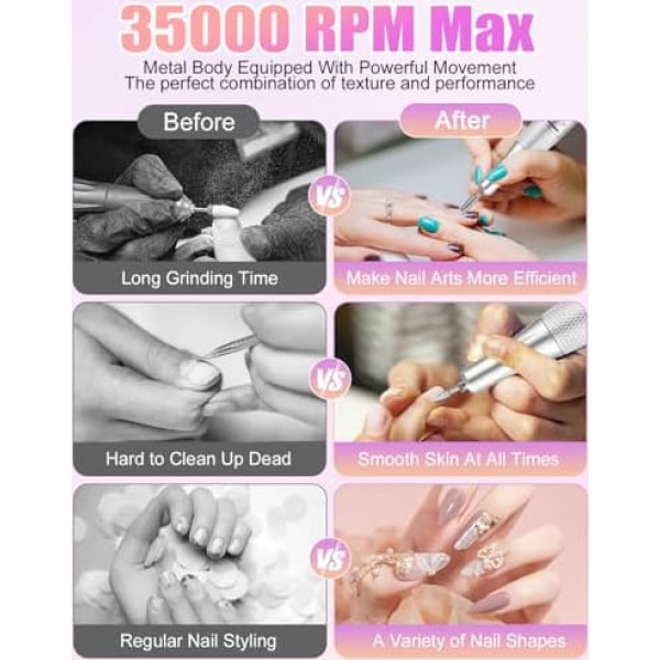 Rechargeable & Portable The nail clippers can be used not only during charging, but also afterwards. The small and exquisite design of the electric manicure kit allows you to wear it anytime and use almost anywhere. Practical and Durable This professional nail clippers features a powerful battery with a capacity of 1200mAh that lasts up to 4-5 hours on a single charge. Electric nail clippers are more beginner-friendly and can give you the best experience. Adjustable Speed & Rotation Direction The speed of the electric pedicure kit for foot care can be varied between 0 and 35,000 RPM. Press the button for two seconds to start the engine, and press the R/F button to select the direction of rotation - left or right. Manicure re-set Re easier and safer to use. PROFESSIONAL NAIL FILE The nail drill comes with 6 interchangeable bits and a USB port. You can read the speed of the nail cutter on the LED display and replace the cutter easily and without tools, so you can shorten and polish your nails easier and faster as well as remove unwanted cuticles. Suitable for home and salon: The nail cutter for gel nails is suitable for removing acrylic, gel and natural nails, making it a good choice for beginners and professional nail technicians. The nail cutter machine is easy to use and available in mini format, making it a great gift option › See more product details; Product description Product description Electric Nail Cutter 35000 rpm, Electric Nail Drill Kit, Professional Manicure Set, Portable Nail Drill, USB Rechargeable Electric Nail File Bits for Gel Nails Nail Polish Directions 1. Plug in the USB charger to charge the electric nail file. 2. Press the button for two seconds to start the engine. 3. Press the ON/OFF button to select the direction of rotation - left or right. 4. Use the nail file to polish, smooth or remove excess cuticles. 5. To change the speed, press the + or - button. 6. To change the drill, remove the used drill and insert the new drill. 7. Clean the nail file after each use. Safety Warning Attention: wear goggles and gloves during use. Keep away from children and pets. Do not use on flammable surfaces. Stop using in case of overheating or smoke. See more; Product description Product description Electric Nail Cutter 35000 rpm, Electric Nail Drill Kit, Professional Manicure Set, Portable Nail Drill, USB Rechargeable Electric Nail File Bits for Gel Nails Nail Polish Directions 1. Plug in the USB charger to charge the electric nail file. 2. Press the button for two seconds to start the engine. 3. Press the ON/OFF button to select the direction of rotation - left or right. 4. Use the nail file to polish, smooth or remove excess cuticles. 5. To change the speed, press the + or - button. 6. To change the drill, remove the used drill and insert the new drill. 7. Clean the nail file after each use. Safety Warning Attention: wear goggles and gloves during use. Keep away from children and pets. Do not use on flammable surfaces. Stop using in case of overheating or smoke. See more; Product description Electric Nail Cutter 35000 rpm, Electric Nail Drill Kit, Professional Manicure Set, Portable Nail Drill, USB Rechargeable Electric Nail File Bits for Gel Nails Nail Polish Directions 1. Plug in the USB charger to charge the electric nail file. 2. Press the button for two seconds to start the engine. 3. Press the ON/OFF button to select the direction of rotation - left or right. 4. Use the nail file to polish, smooth or remove excess cuticles. 5. To change the speed, press the + or - button. 6. To change the drill, remove the used drill and insert the new drill. 7. Clean the nail file after each use. Safety Warning Attention: wear goggles and gloves during use. Keep away from children and pets. Do not use on flammable surfaces. Stop using in case of overheating or smoke. See more