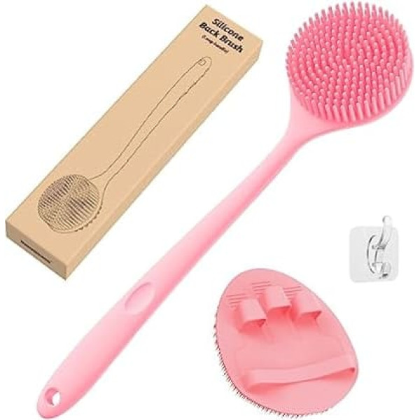 Safe Material:One-piece design and food grade silicone. 100% BPA free, super durable and environmentally friendly. It is completely odourless and non-toxic, compared to those made of plastic and nylon. 【Super Scrubbing & Exfoliating Back Scrubber】Special 15 inch long and slightly curved handle design helps you clean your back and feet easily. Non-slip handle and hanging hole make it easy to hold and hang dry. Long and thick bristles are not good at lathering, but excellent for scrubbing and massaging. SUPER FOAM & DEEP CLEANSING SOFT BATH GLOVE - Unique design with high and low and very thin bristles to increase the enormous foaming power and help you clean your skin even to the pores. Built with a hand strap and three finger straps to fit your palm. Anti-slip lines in front of each finger tape to prevent the brush from slipping. LIGHTWEIGHT & EASY TO USE The Manmihealth back brush weighs only 5.5 ounces. We have filled nylon material inside the handle to make it sturdy but lightweight. Manmihealth soft shower luffa is only 44g(1.55oz). With four-band design, you can wear it as a glove brush. Your hand will not feel sore even after holding for a long time. Easy to clean and hygienic: silicone material is easy to clean, quick-drying and does not easily produce bacteria. You just need to rinse it and hang it to dry. Package includes: back brush x 1; soft brush x 1; strong adhesive hook x 1. › See more product details; Product description ManmiHealth Silicone Back Scrubber + Soft Silicone Body Brush; Product description ManmiHealth Silicone Back Scrubber + Soft Silicone Body Brush; ManmiHealth Silicone Back Scrubber + Soft Silicone Body Brush