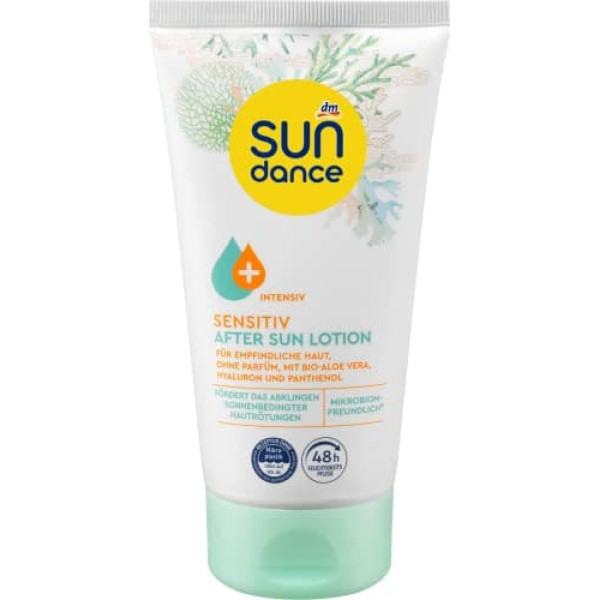 SUNDANCE Set of 2 After Sun Sensitive Skin Care: Lotion for Sensitive Skin without Perfume (150 ml) + Aprés Balm Moisturiser with Panthenol, Bisabolol, Aloe Vera & Vitamin E (200 ml), 350 ml After Sun Sensitive Lotion: soothes and supports skin regeneration after sunbathing. Intensive 48 hour moisturiser. For sensitive skin: without perfume. Promotes sun-induced redness to fade Product features: without perfume, vegan Aprés Balm Sensitive: 24h moisturiser for sensitive skin. Skin soothing Skin compatibility dermatologically tested. Made in Germany Box contents: 1 x After Sun Balm Sensitive, 1 x After Sun Lotion Sensitive › See more product details; Product description Product description The SUNDANCE After Sun Sensitive Lotion 48h has a regenerating and cooling effect. The intensive care formula with organic aloe vera, vitamin E and panthenol has a soothing effect on sun-stressed and dry skin. Intensive moisturisers have a harmonising effect on the natural moisture balance of the skin. Regular application supports a beautiful, long-lasting sun tan. Instructions for use: apply generously to cleansed skin after sunbathing. Easy to spread and absorbs quickly without leaving a greasy film. Intensive 24-hour moisturiser for sensitive skin: the SUNDANCE Aprés Balm Sensitive is characterised by a nourishing active ingredient complex with panthenol and bisabolol. In addition, aloe vera and glycerine ensure velvety soft and supple skin. The After Sun Balm Sensitive counteracts drying of the skin for a long time. In addition, vitamin E protects the skin from free radicals with regular use. Formulated without microplastics and water-soluble pure synthetic polymers. Made for: dm-drogerie markt GmbH + Co. KG, Am dm-Platz 1, 76227 Karlsruhe. Safety Warning Avoid contact with eyes and mucous membranes. Use only on intact skin. Avoid direct sunlight. Do not store above 25 degrees Celsius. Keep out of reach of children; Product description Product description The SUNDANCE After Sun Sensitive Lotion 48h has a regenerating and cooling effect. The intensive care formula with organic aloe vera, vitamin E and panthenol has a soothing effect on sun-stressed and dry skin. Intensive moisturisers have a harmonising effect on the natural moisture balance of the skin. Regular application supports a beautiful, long-lasting sun tan. Instructions for use: apply generously to cleansed skin after sunbathing. Easy to spread and absorbs quickly without leaving a greasy film. Intensive 24-hour moisturiser for sensitive skin: the SUNDANCE Aprés Balm Sensitive is characterised by a nourishing active ingredient complex with panthenol and bisabolol. In addition, aloe vera and glycerine ensure velvety soft and supple skin. The After Sun Balm Sensitive counteracts drying of the skin for a long time. In addition, vitamin E protects the skin from free radicals with regular use. Formulated without microplastics and water-soluble pure synthetic polymers. Made for: dm-drogerie markt GmbH + Co. KG, Am dm-Platz 1, 76227 Karlsruhe. Safety Warning Avoid contact with eyes and mucous membranes. Use only on intact skin. Avoid direct sunlight. Do not store above 25 degrees Celsius. Keep out of reach of children; Product description The SUNDANCE After Sun Sensitive Lotion 48h has a regenerating and cooling effect. The intensive care formula with organic aloe vera, vitamin E and panthenol has a soothing effect on sun-stressed and dry skin. Intensive moisturisers have a harmonising effect on the natural moisture balance of the skin. Regular application supports a beautiful, long-lasting sun tan. Instructions for use: apply generously to cleansed skin after sunbathing. Easy to spread and absorbs quickly without leaving a greasy film. Intensive 24-hour moisturiser for sensitive skin: the SUNDANCE Aprés Balm Sensitive is characterised by a nourishing active ingredient complex with panthenol and bisabolol. In addition, aloe vera and glycerine ensure velvety soft and supple skin. The After Sun Balm Sensitive counteracts drying of the skin for a long time. In addition, vitamin E protects the skin from free radicals with regular use. Formulated without microplastics and water-soluble pure synthetic polymers. Made for: dm-drogerie markt GmbH + Co. KG, Am dm-Platz 1, 76227 Karlsruhe. Safety Warning Avoid contact with eyes and mucous membranes. Use only on intact skin. Avoid direct sunlight. Do not store above 25 degrees Celsius. Keep out of reach of children