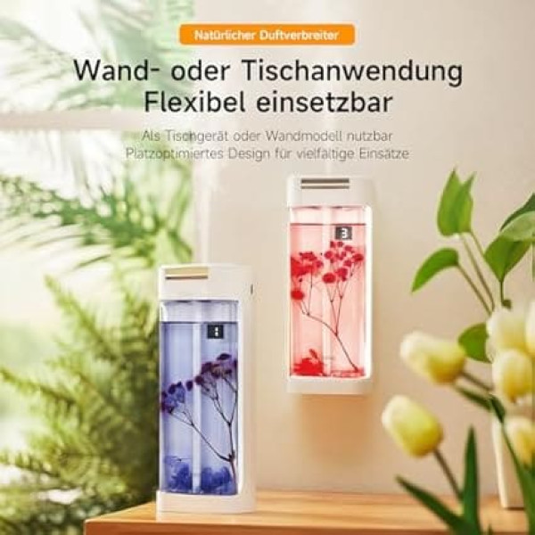 Real flowers & feel-good fragrance: our waterless fragrance diffuser combines real flowers with high-quality essential oils (230 ml, lavender & gardenia) for visual and olfactory well-being. Perfect as a home or office fragrance. 4 intensity levels & long range: Individual fragrance control by 4 modes: strong (5s/5min), medium (5s/15min), gentle (5s/30min) or continuous operation. Ideal for large spaces and personalized aromatherapy. Luxury fragrance without water - no clogging: no need to recharge water! The Smart Fragrance Diffuser uses special oils for even fragrance distribution - without residue or blockages. Smart Display & Easy Operation: Modern display with battery and mode indicator. The essential oil diffuser impresses with its intuitive handling - simply adjust and enjoy. Flexible placement and refill option: can be used as a table aroma diffuser or wall-mounted (without drilling). Fits in living room, bathroom or home office. Fragrance oil refills sold separately! › See more product details